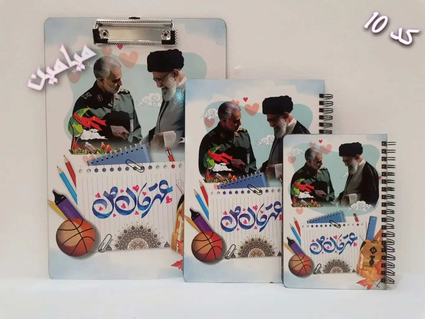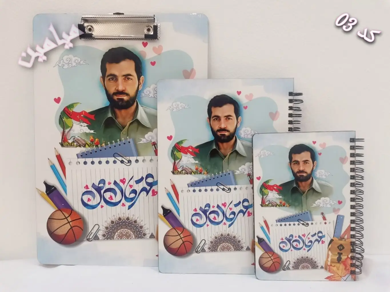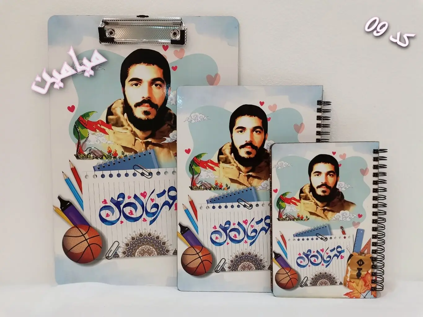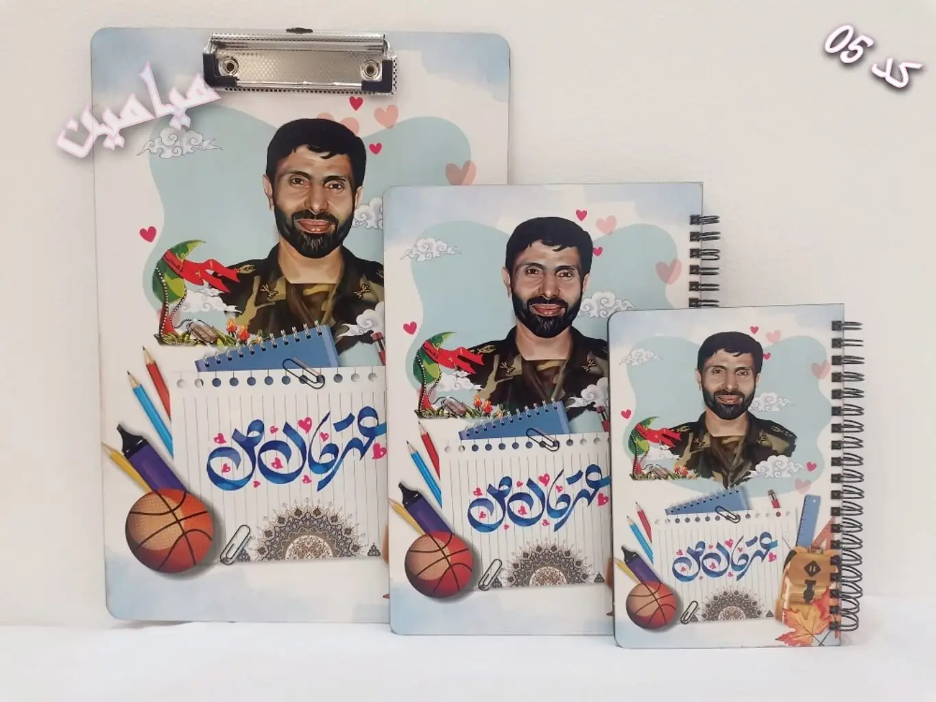 ست نوشت افزار ایرانی اسلامی سری قهرمان من 😍 | تخته شاسی، دفتر و دفترچه | چوبی | تنوع ۱۰ طرح جذاب شهدایی | تک و عمده