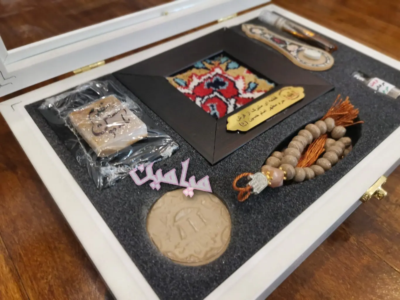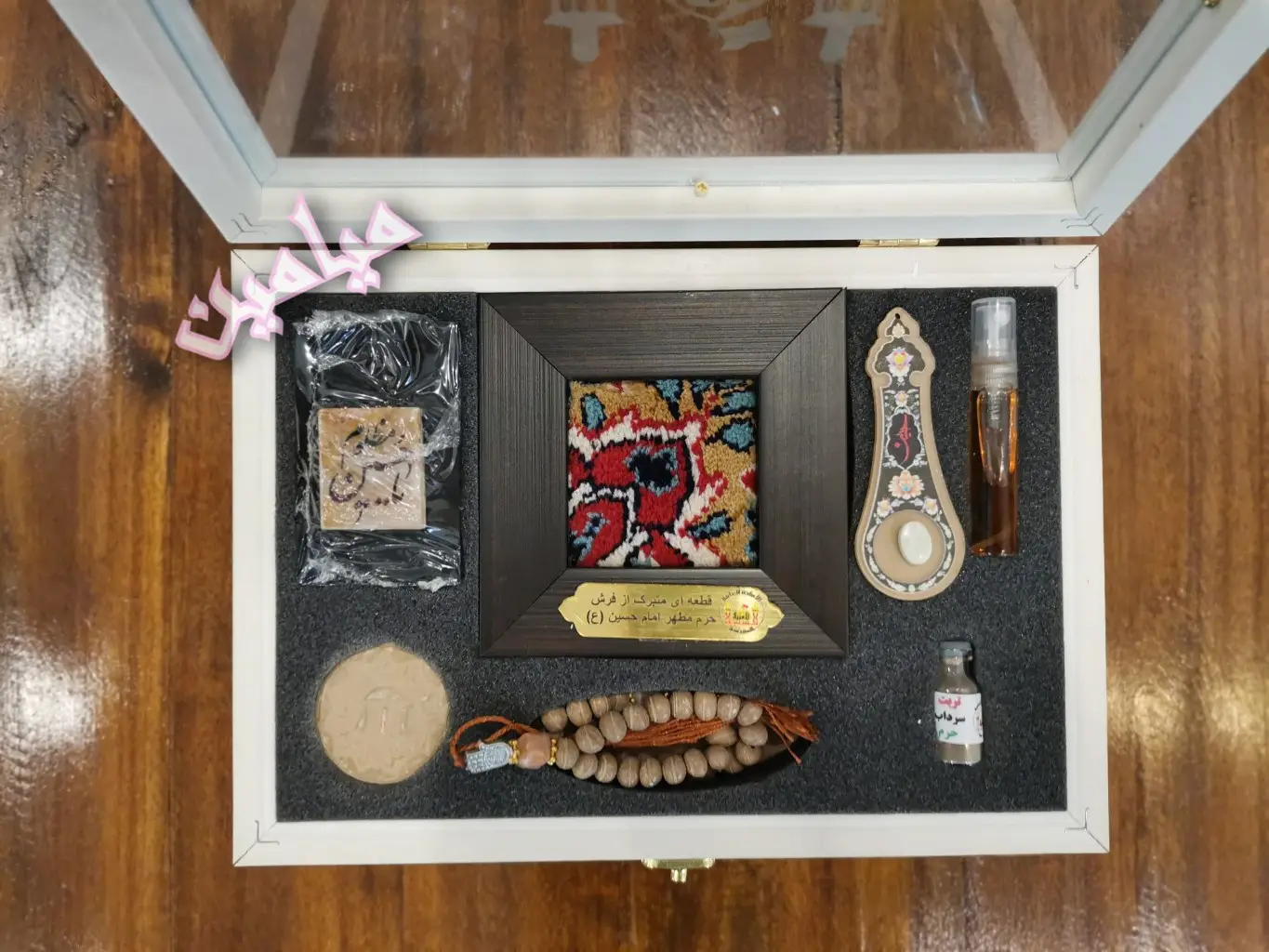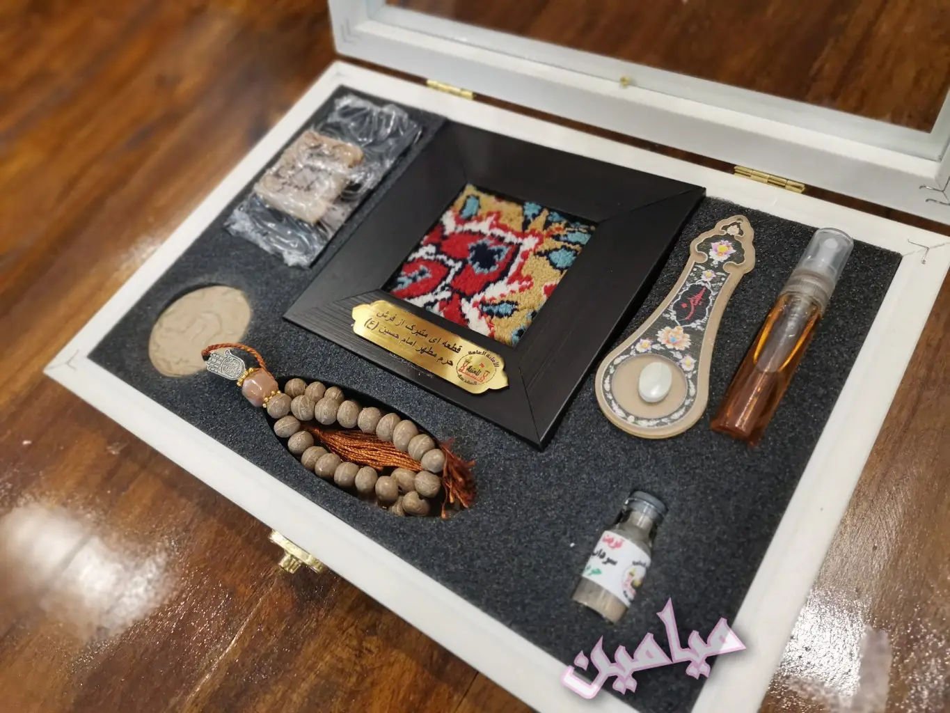 شامل قاب فرش حرم ، نگین انگشتری ، سنگ حرم ، مهر و تسبیح تربت ، شیشه تربت سرداب حرم و عطر