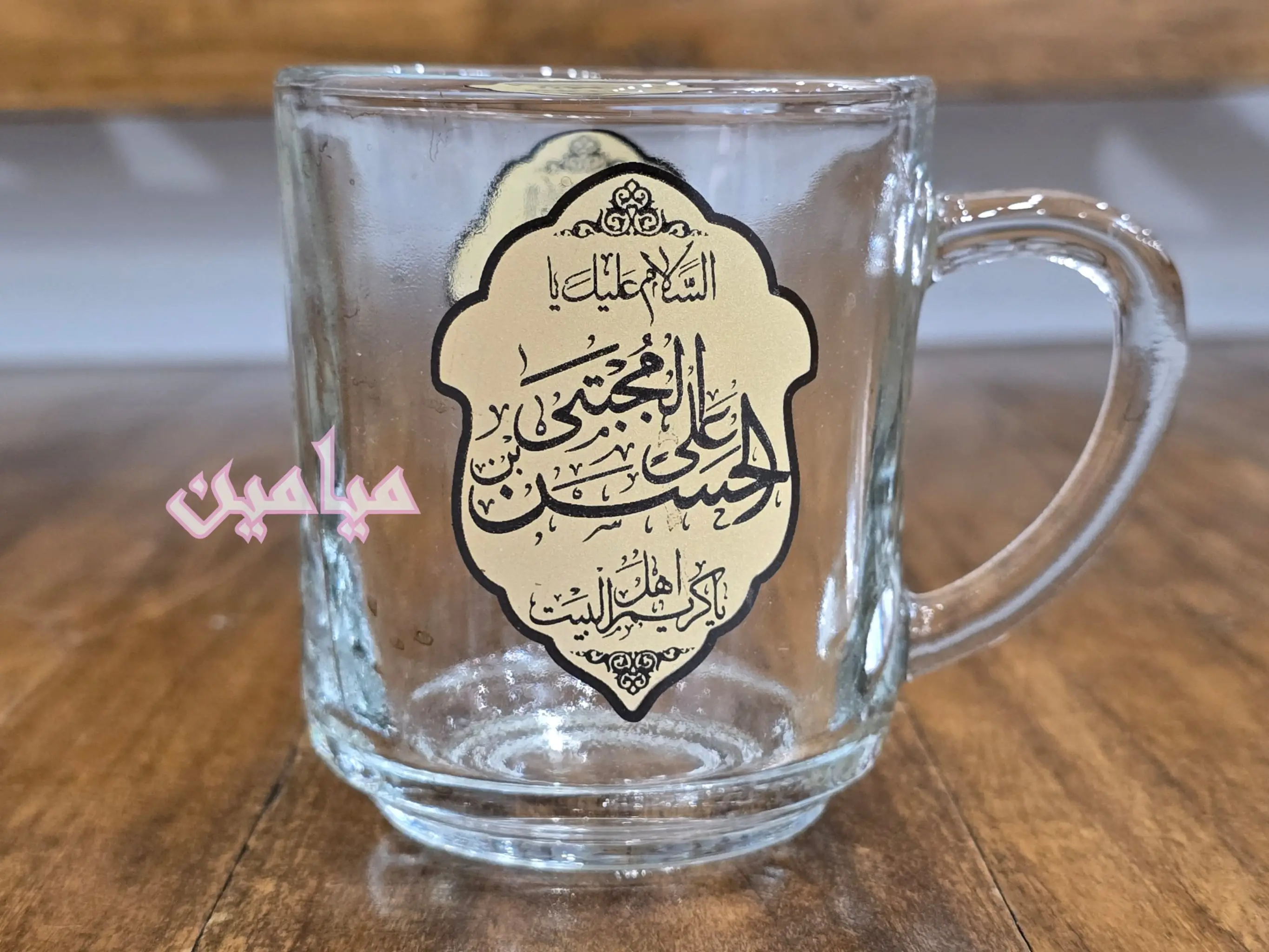 استکان دسته دار بلور طرح نام امام حسن (ع) 🌺 | چاپ ثابت و کوره ای | دست ۶ عددی