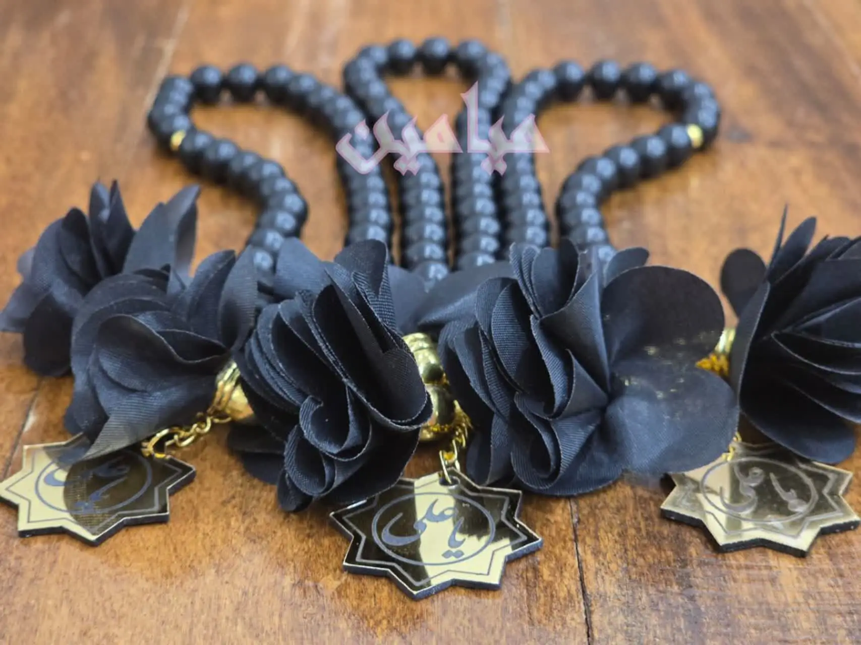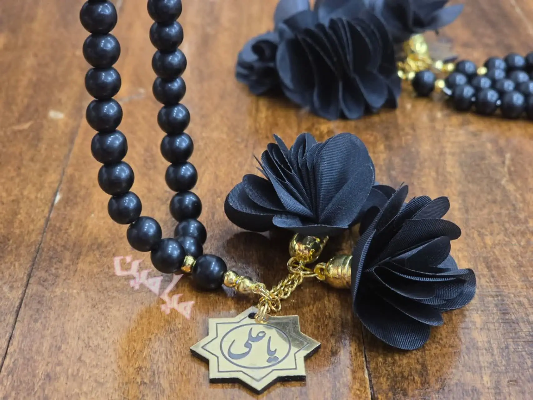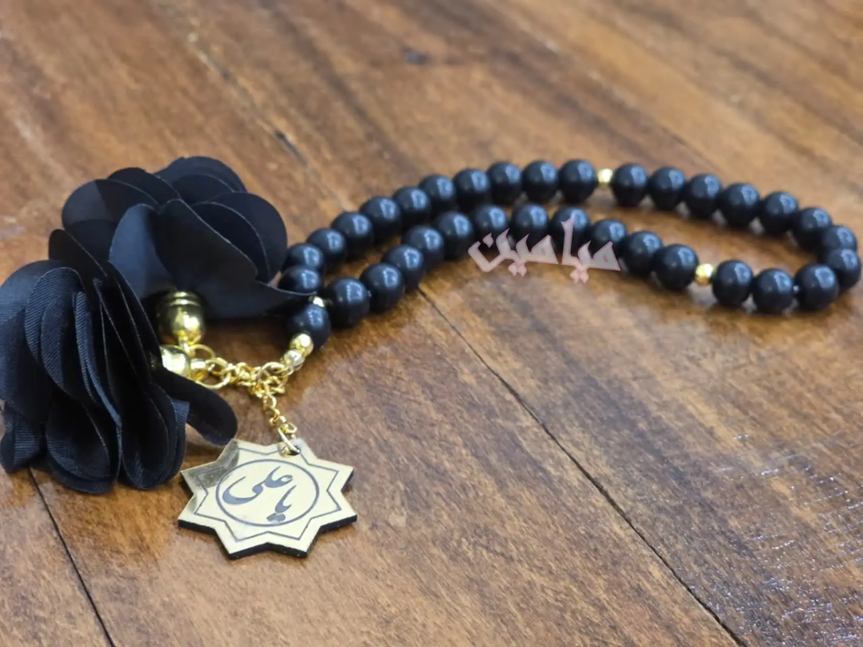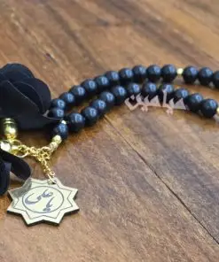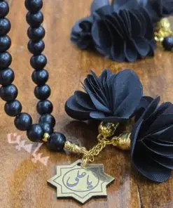 تسبیح اونیکس مشکی گل دار و پلاک دار | جنس مهره اونیکس مات | تسبیح ۳۳ تایی با پلاک طلایی نام مبارک امام علی (ع) | تک و عمده