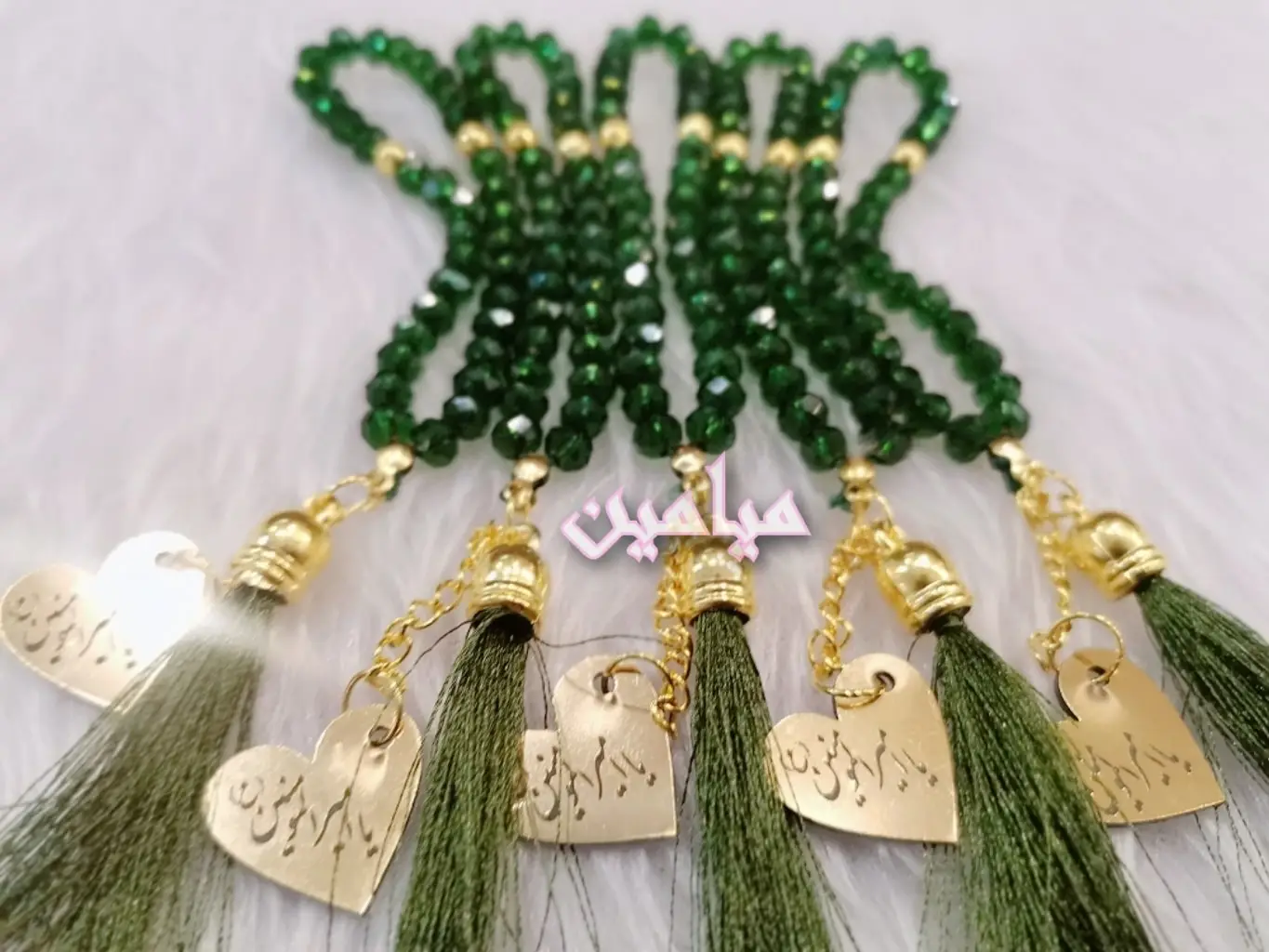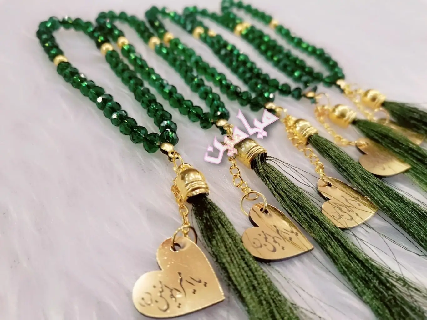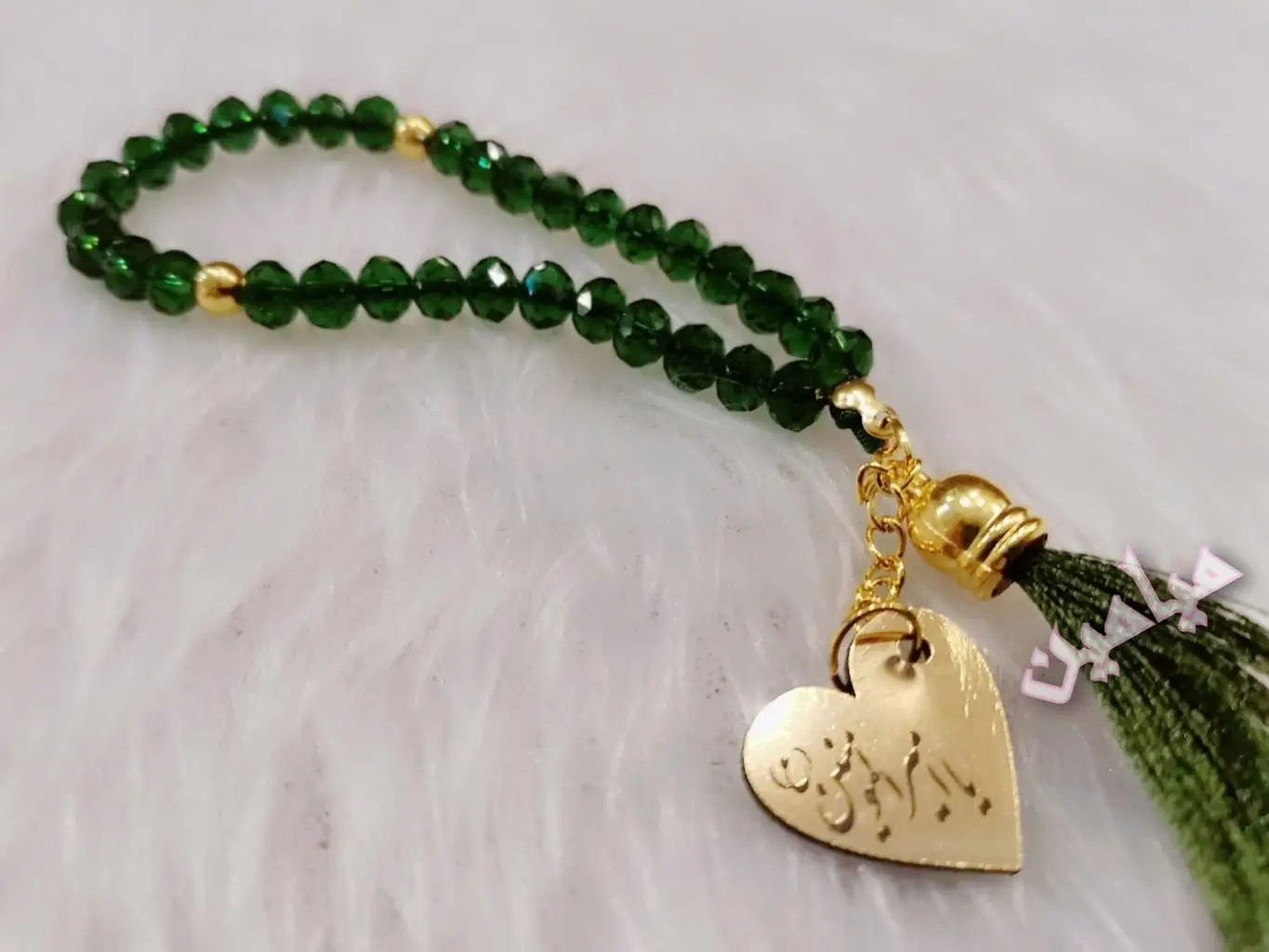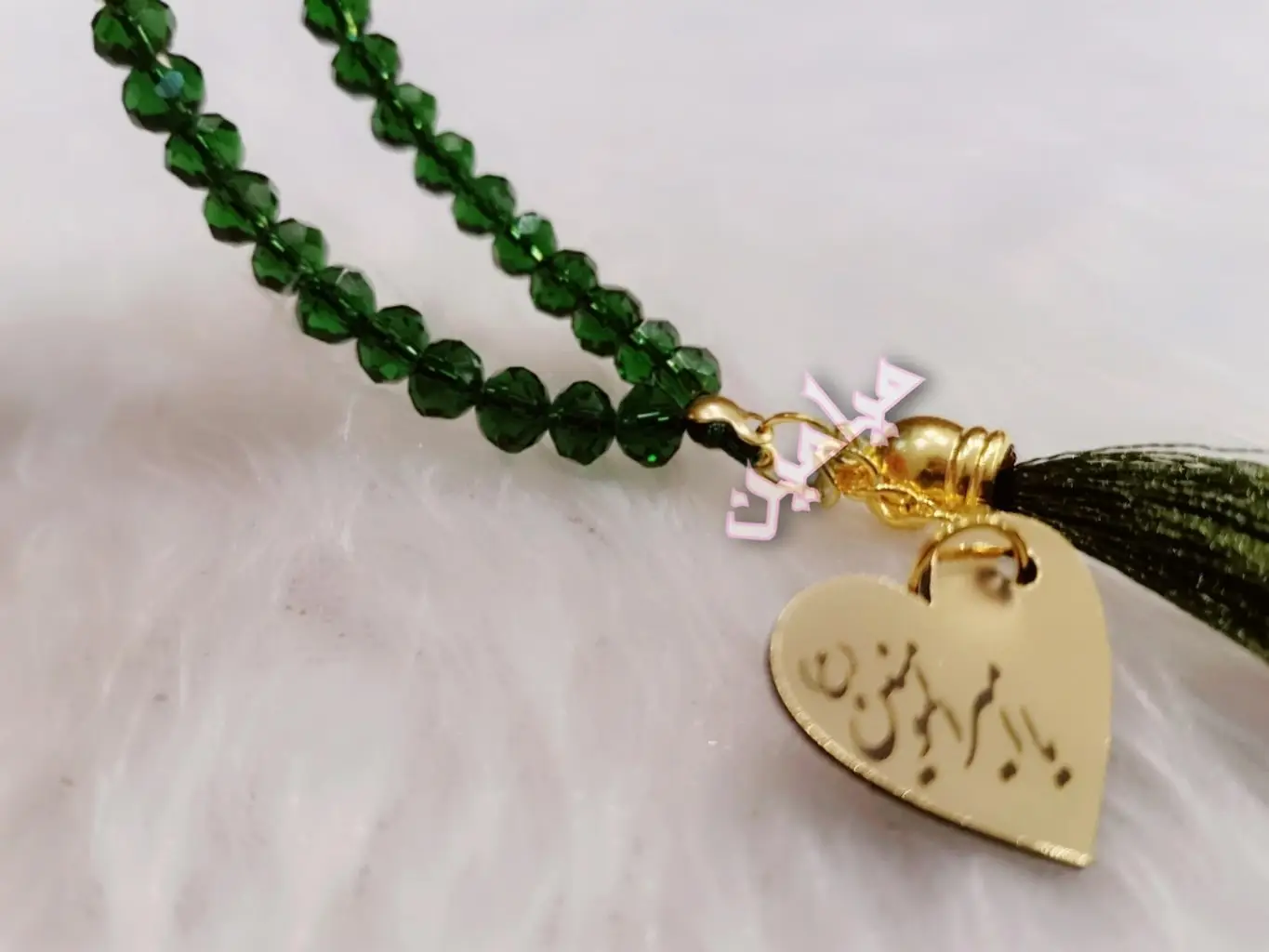 تسبیح سبز کریستالی با پلاک طلایی نام امیرالمؤمنین (ع) 💚 | نمره ۶ | ۳۳ تایی | تک و عمده