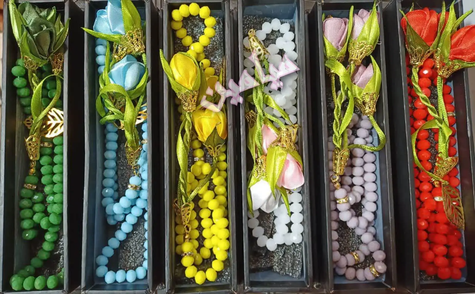 تسبیح نفیس کریستالی رنگی گل دار و ربان دار 😍| ۱۰۰ تایی | بهمراه باکس چوبی جذاب
