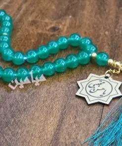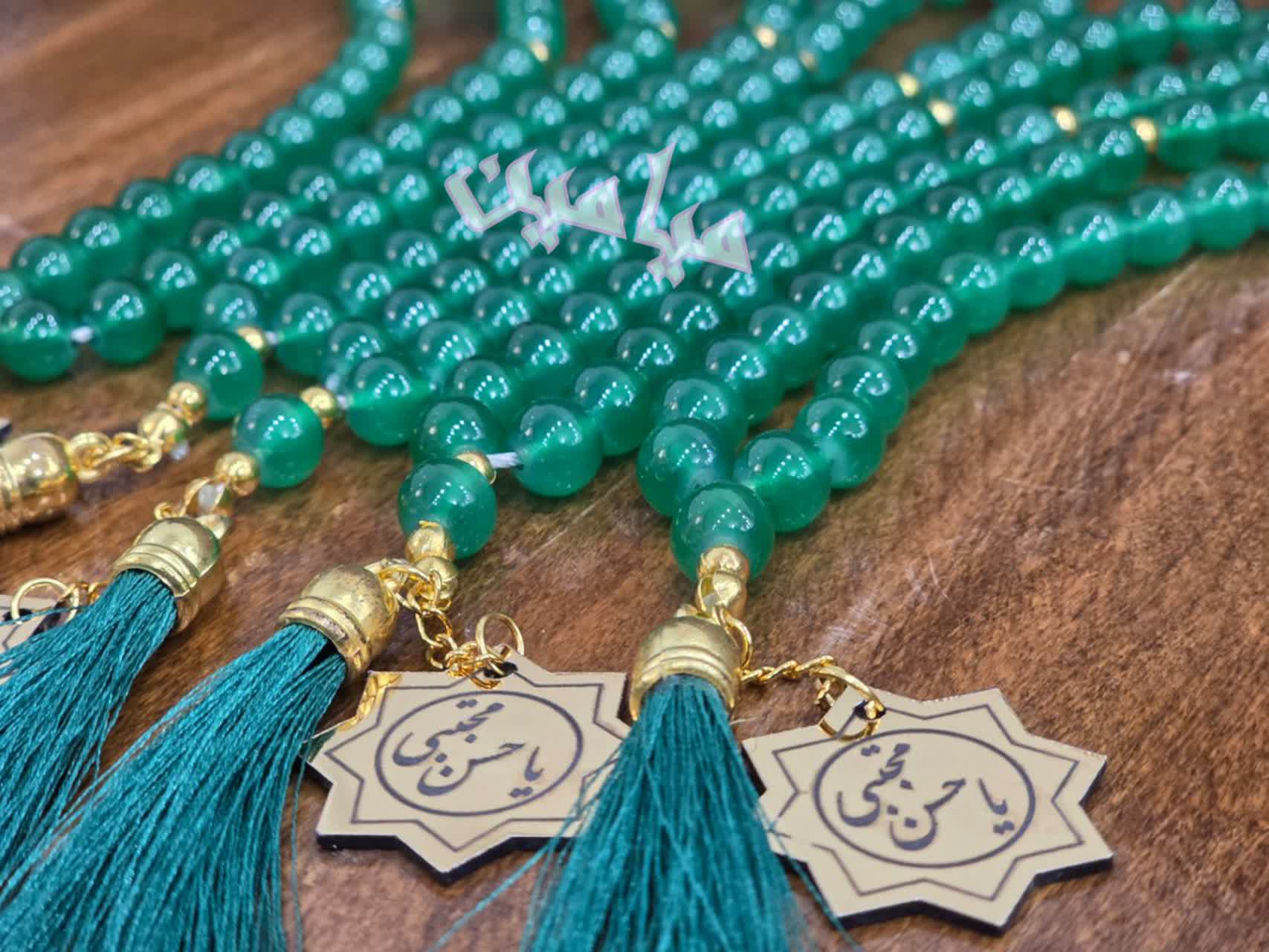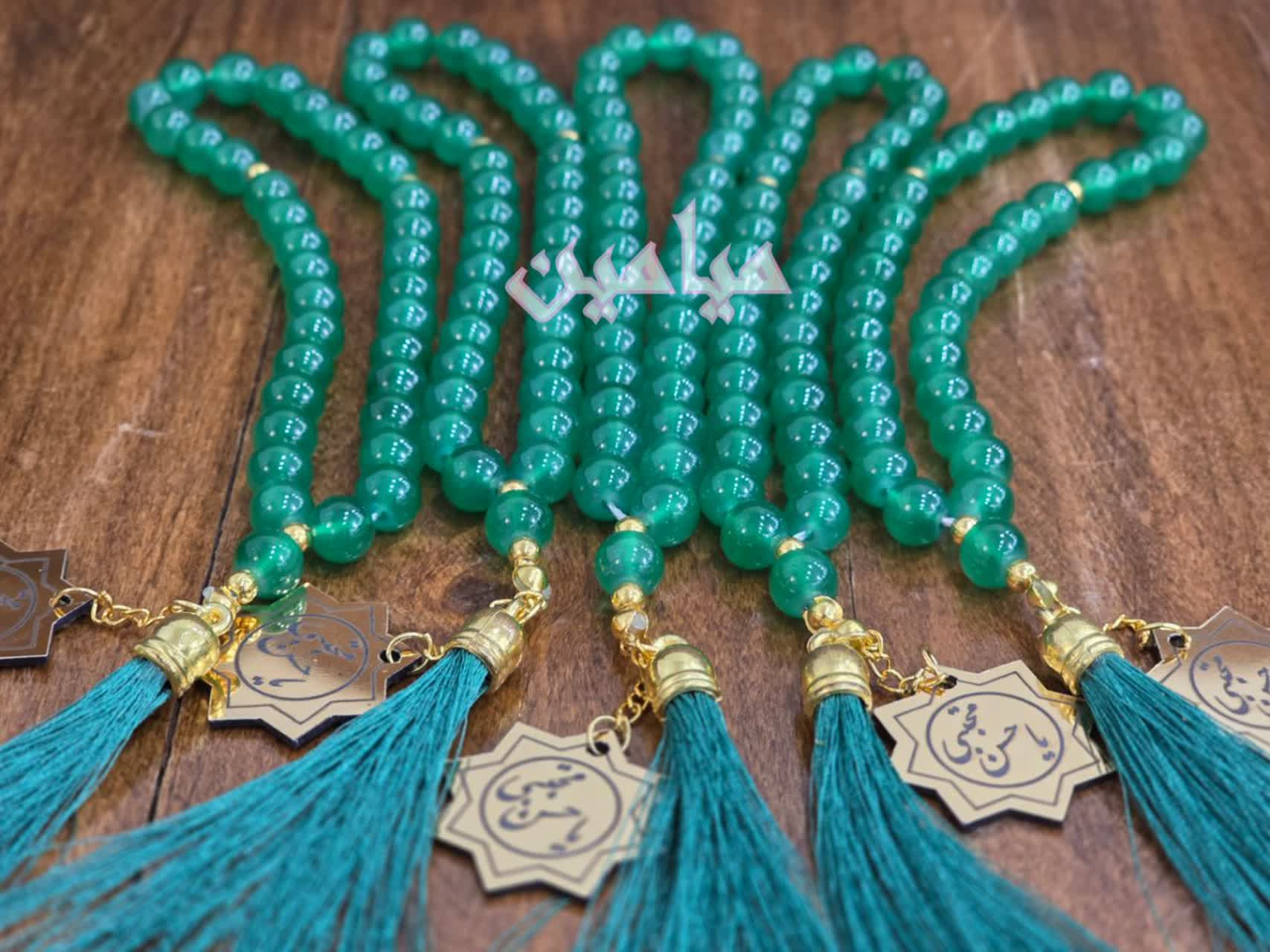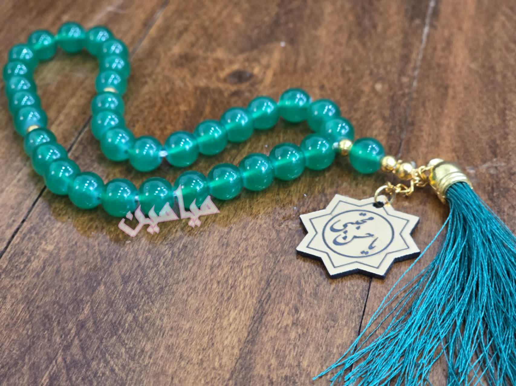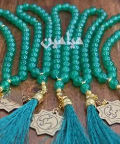 تسبیح یاقوتی ریشه دار و پلاک دار 💚 | تسبیح ۳۳ تایی با پلاک طلایی نام مبارک امام حسن (ع) | تک و عمده