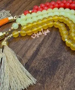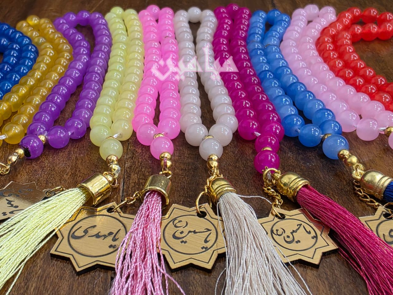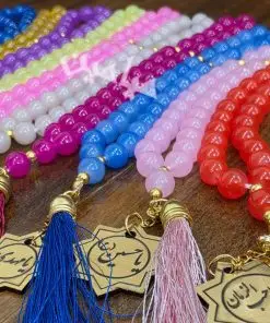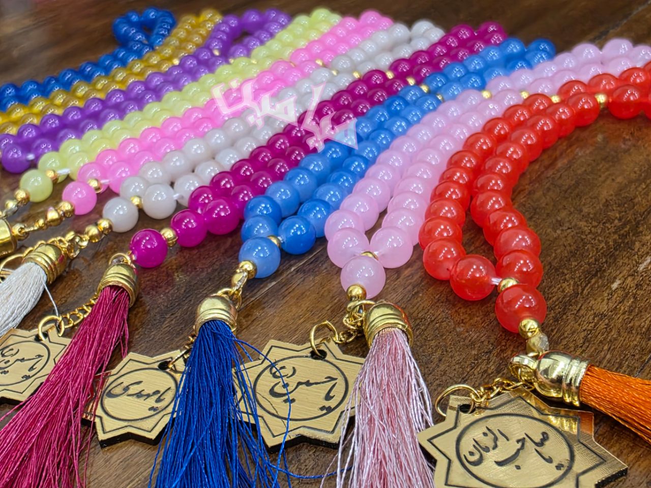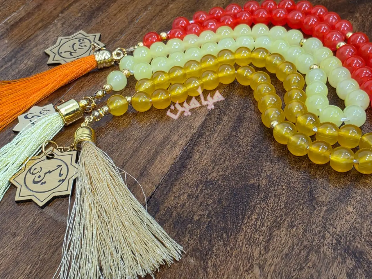 تسبیح یاقوتی ریشه دار و پلاک دار 💛 | ۳۳ تایی | تنوع رنگ های جذاب | با پلاک طلایی نام مبارک ائمه اطهار | تک و عمده