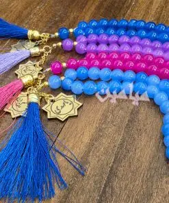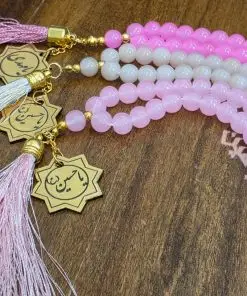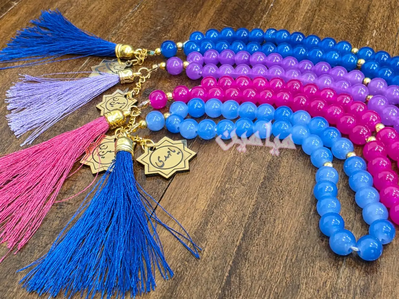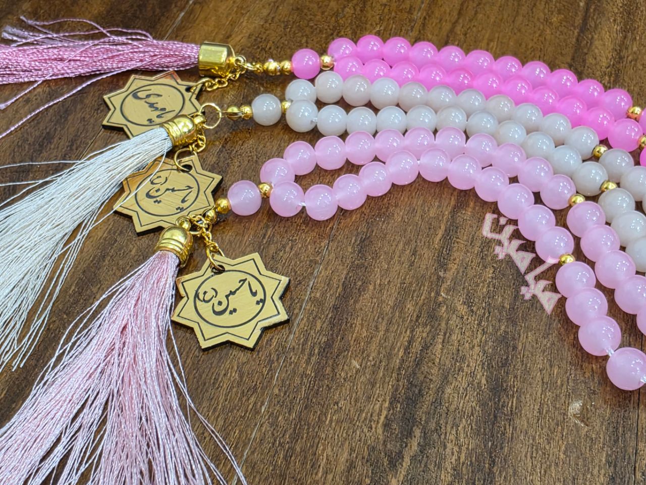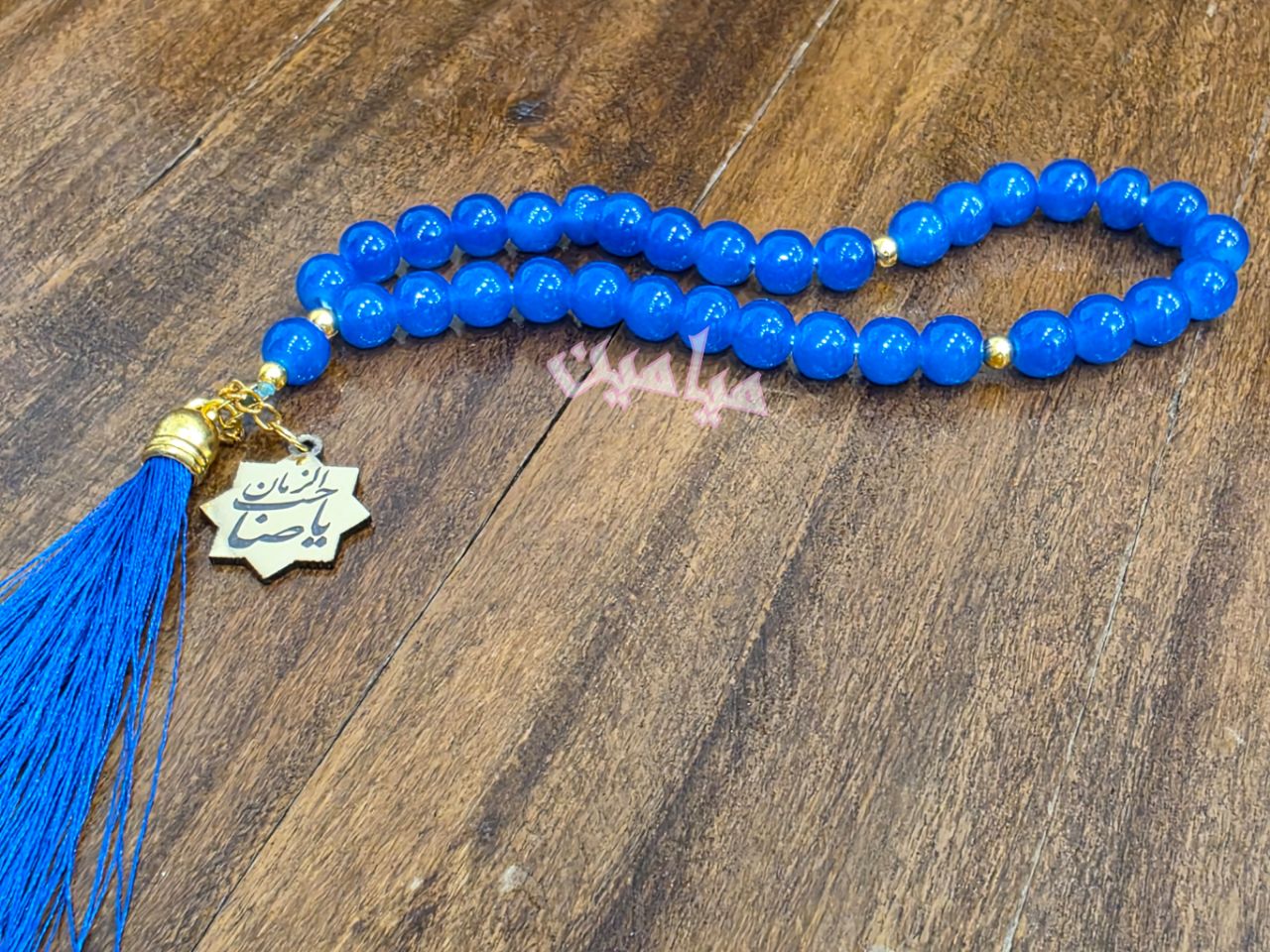 تسبیح یاقوتی ریشه دار و پلاک دار 💛 | ۳۳ تایی | تنوع رنگ های جذاب | با پلاک طلایی نام مبارک ائمه اطهار | تک و عمده