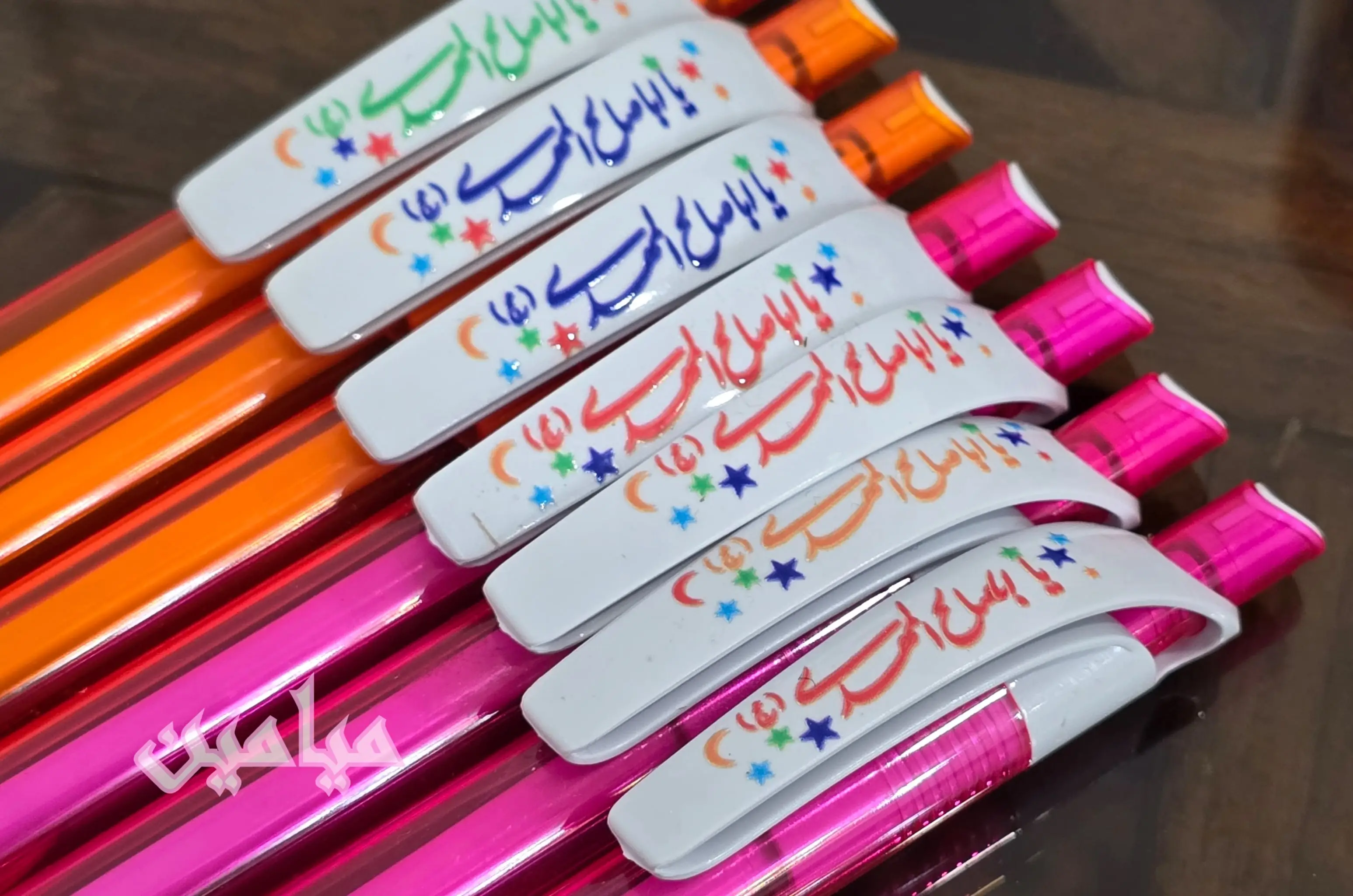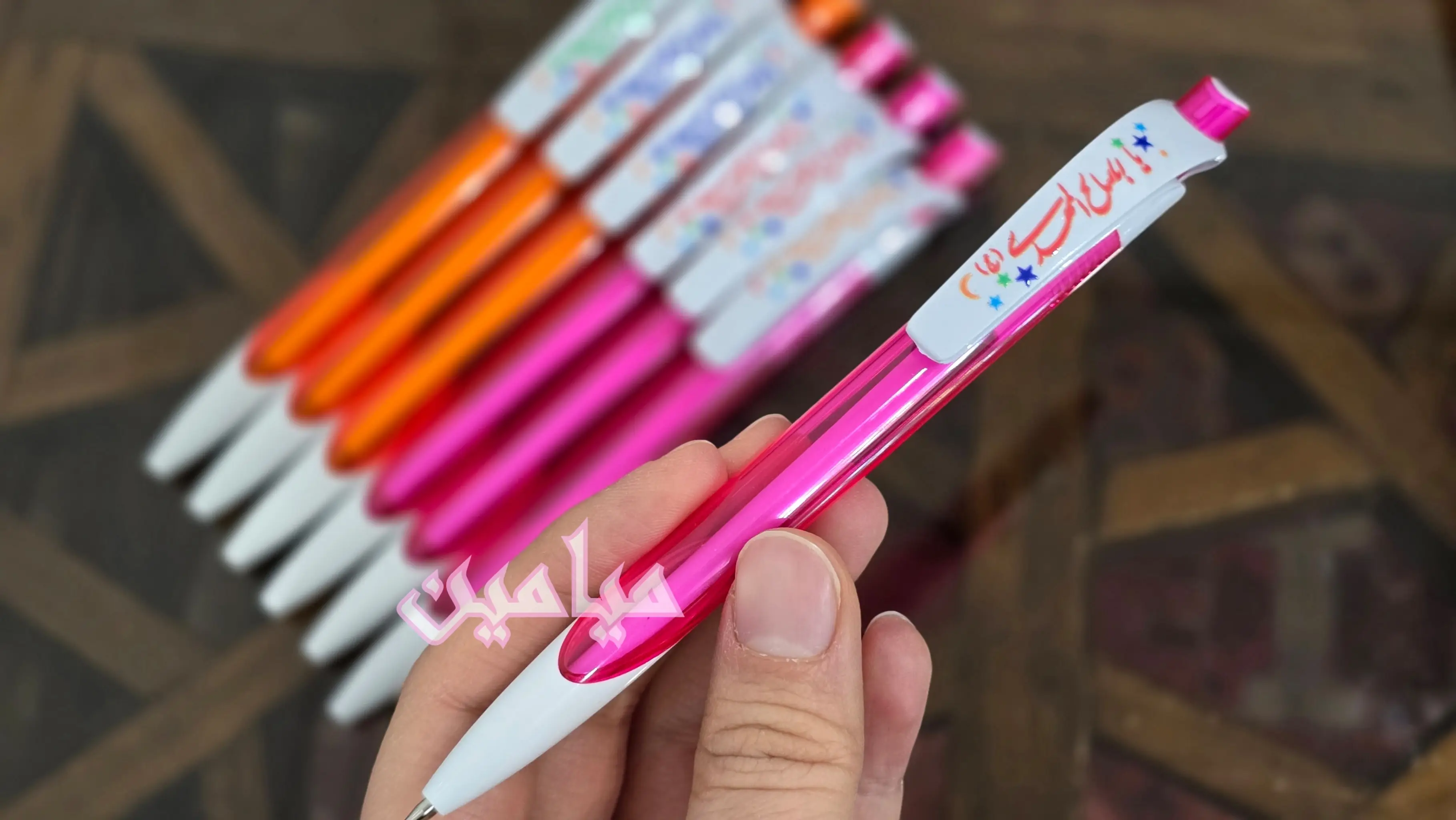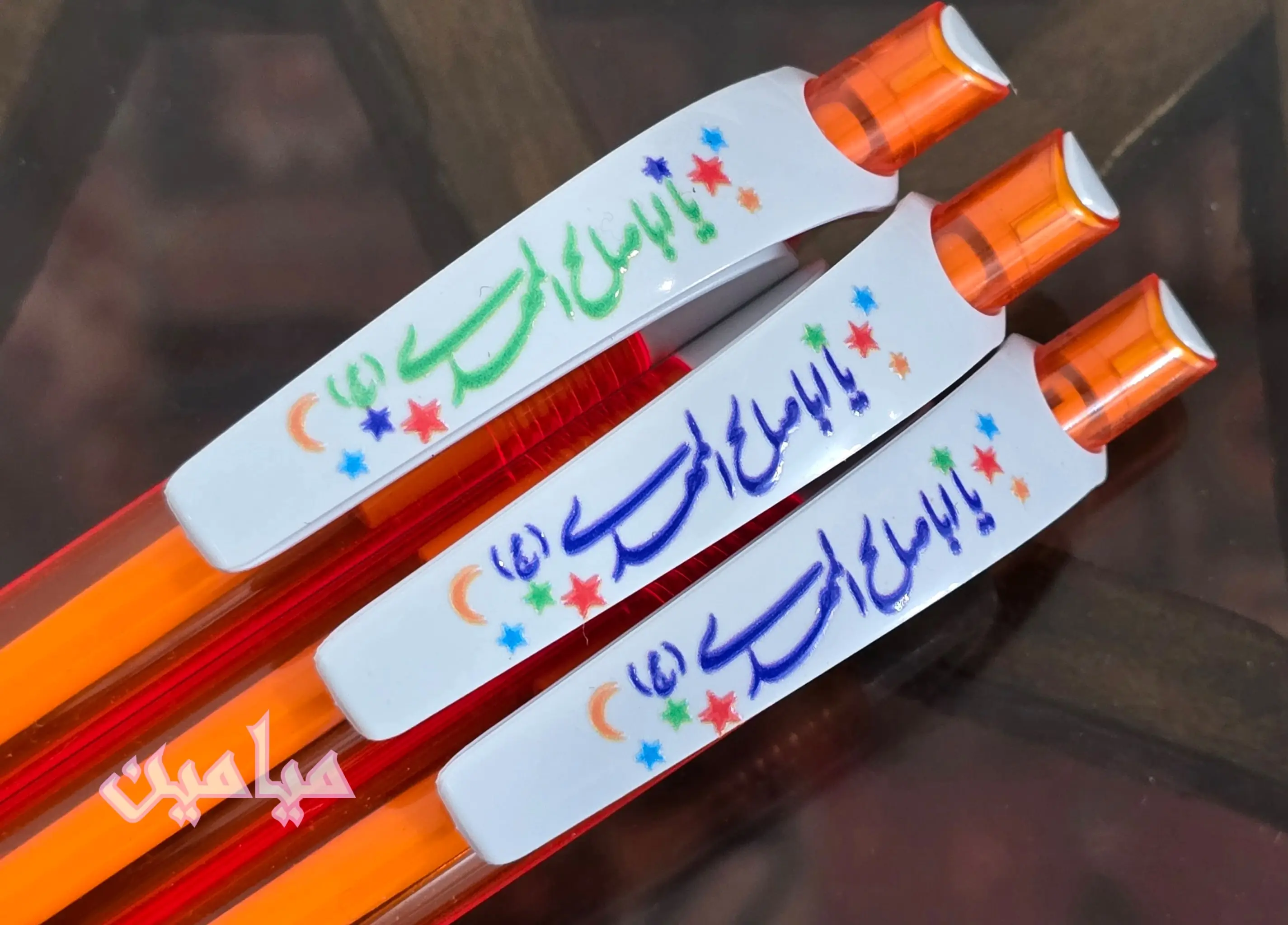 خودکار فشاری طرح یا اباصالح المهدی 😍 | رنگ جوهر آبی | بدنه صورتی و نارنجی چاپ برجسته چهار رنگ | تک و عمده