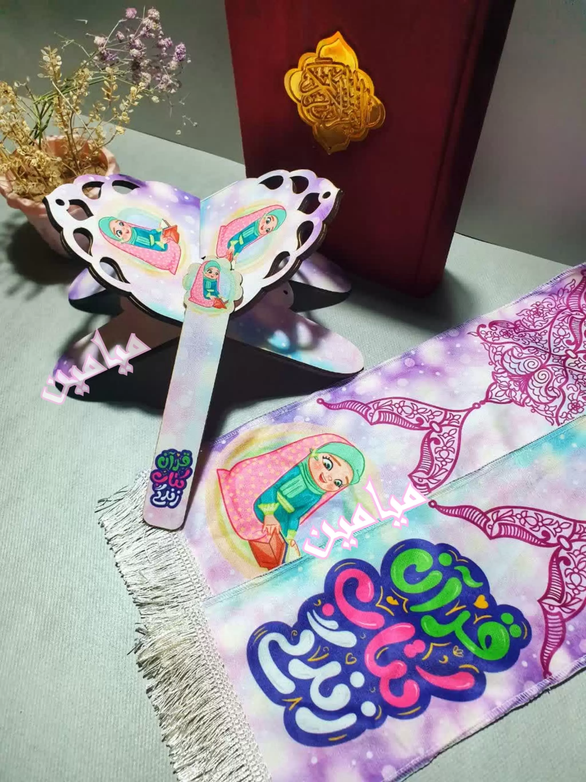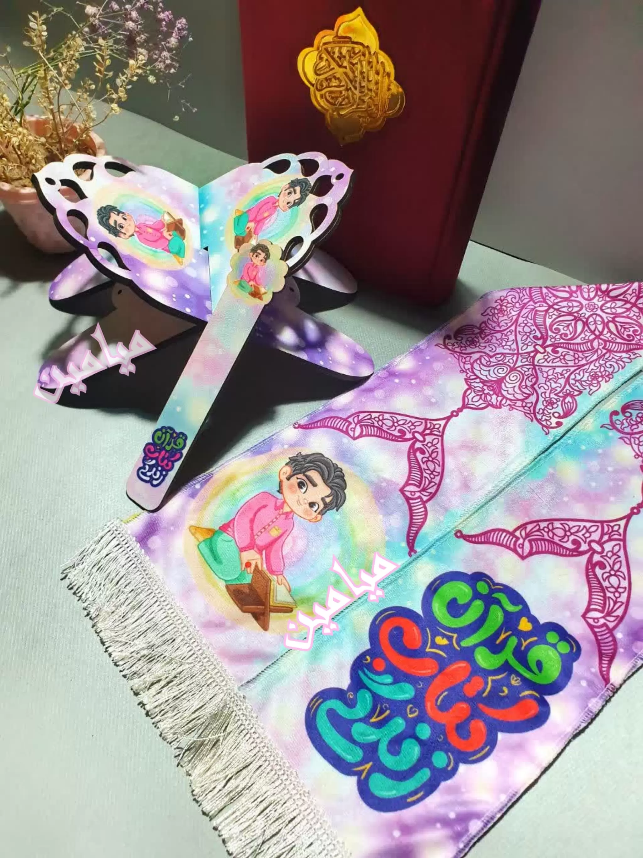پک قرآنی کودکانه 💗| ست رحل و نشانگر چوبی + شال مخمل قرآنی | دخترانه و پسرانه | تک و عمده