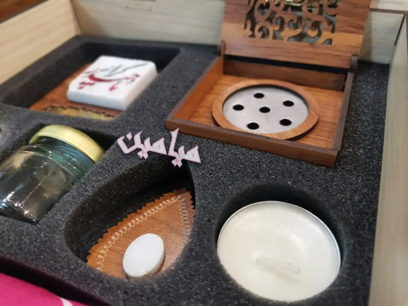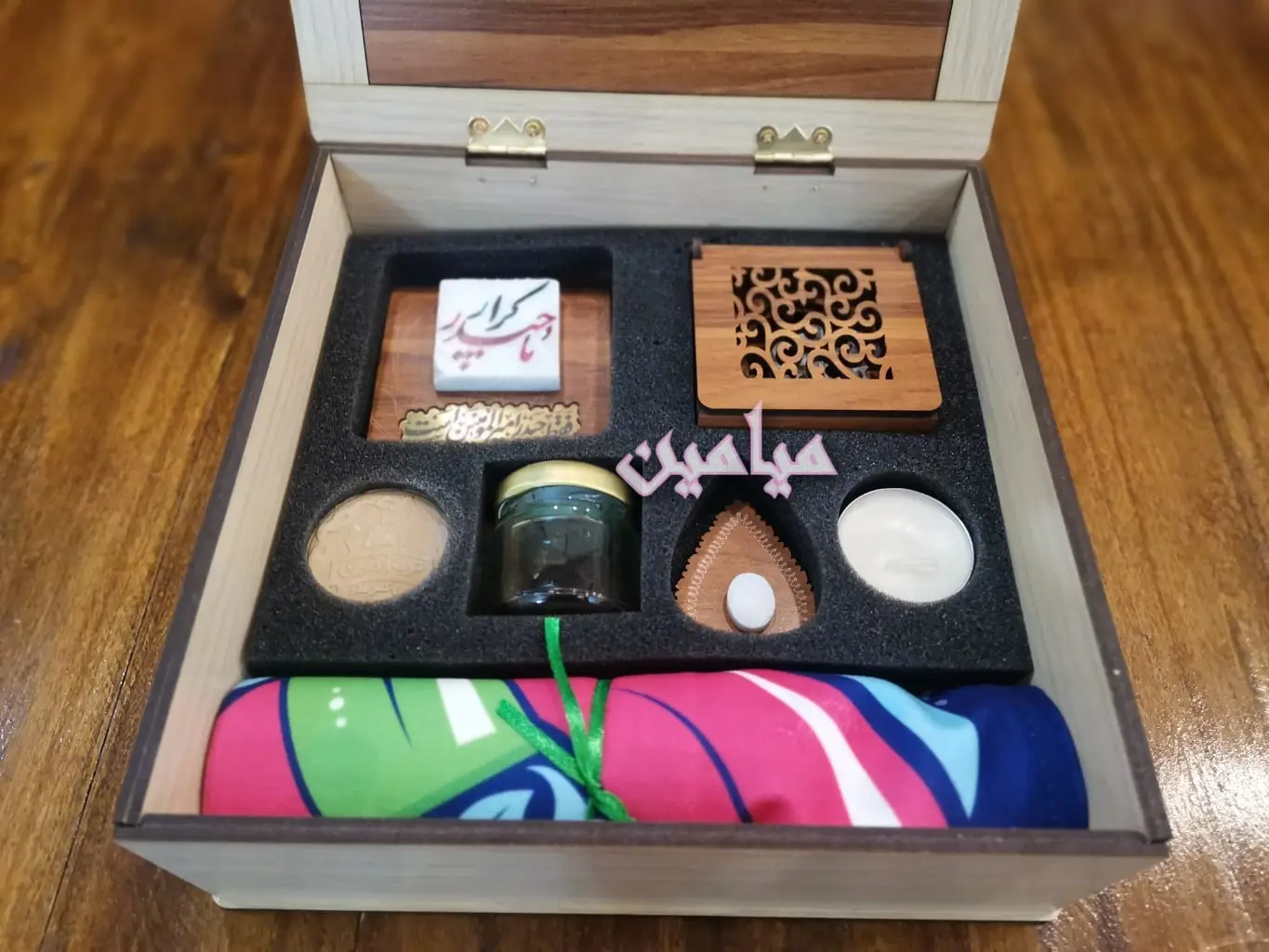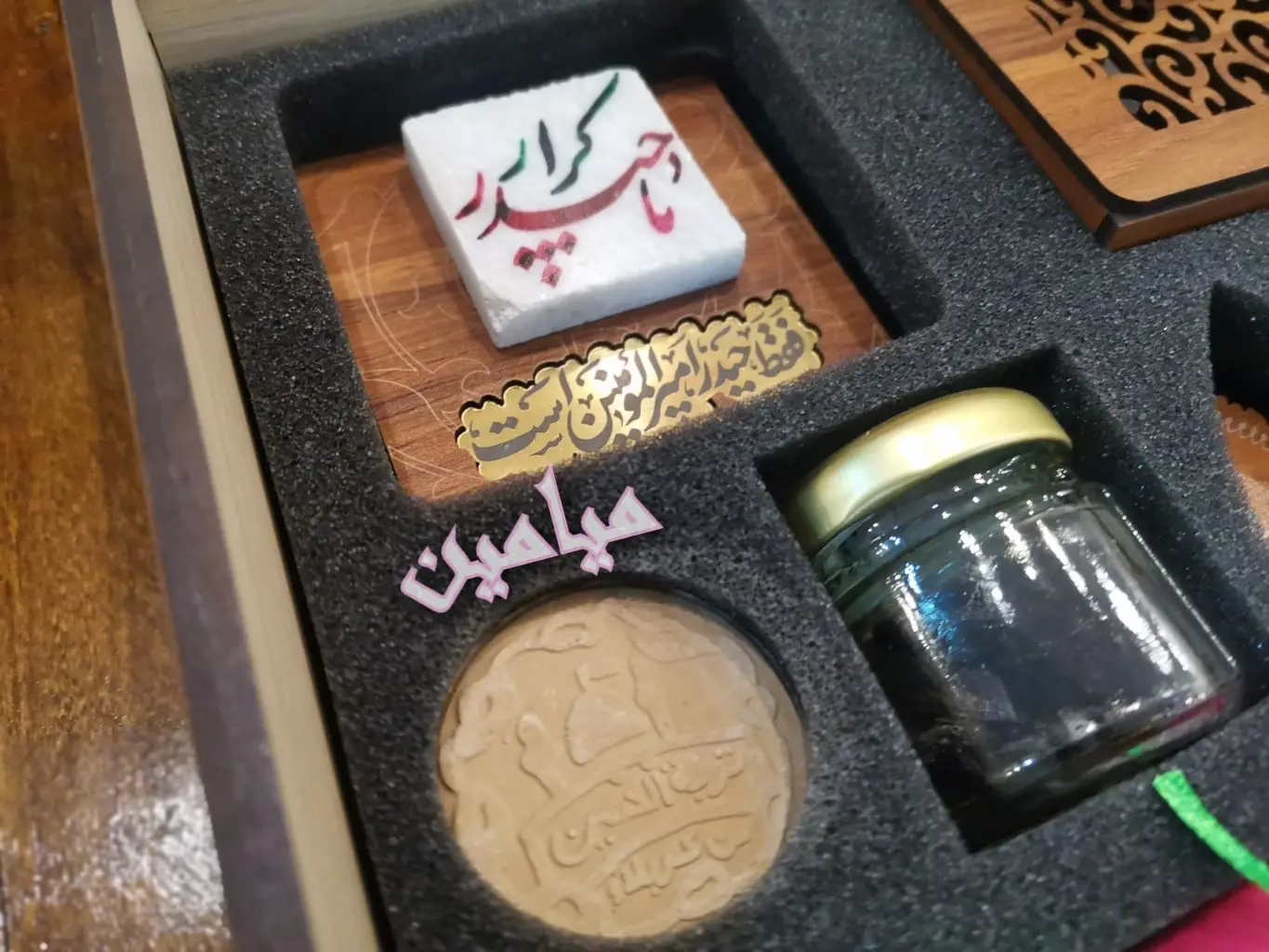 پک نفیس متبرک حرم امام علی (ع) 🌷 | شامل نگین انگشتری ، سنگ حرم ، بخور حرم ، جابخوری ، پرچم مخمل ، شمع وارمر و مهر تربت | دارای باکس چوبی شیک | تک و عمده