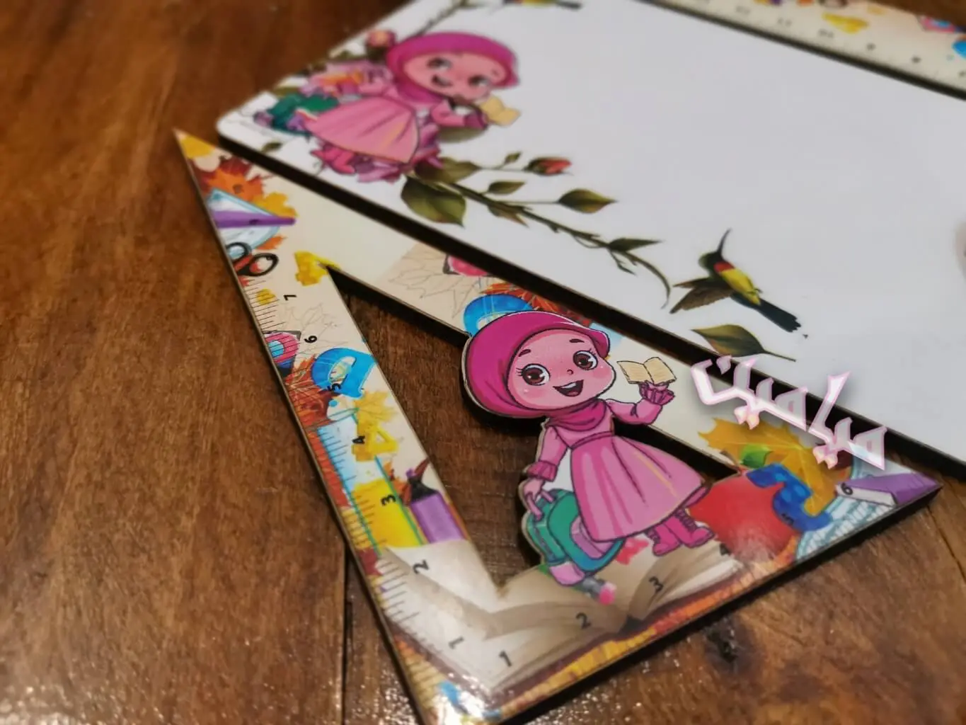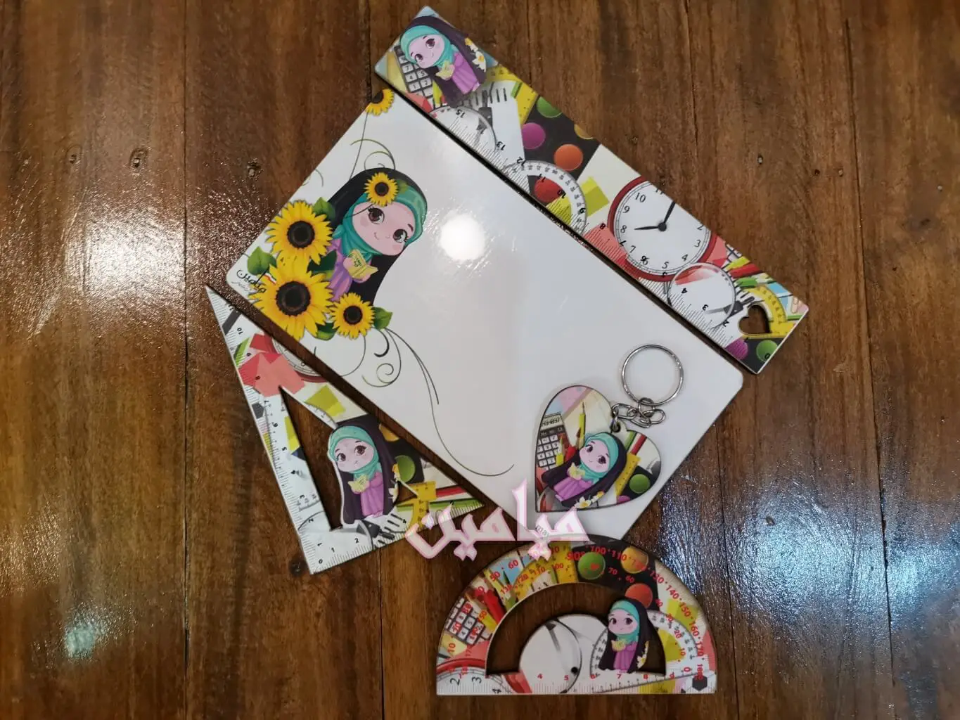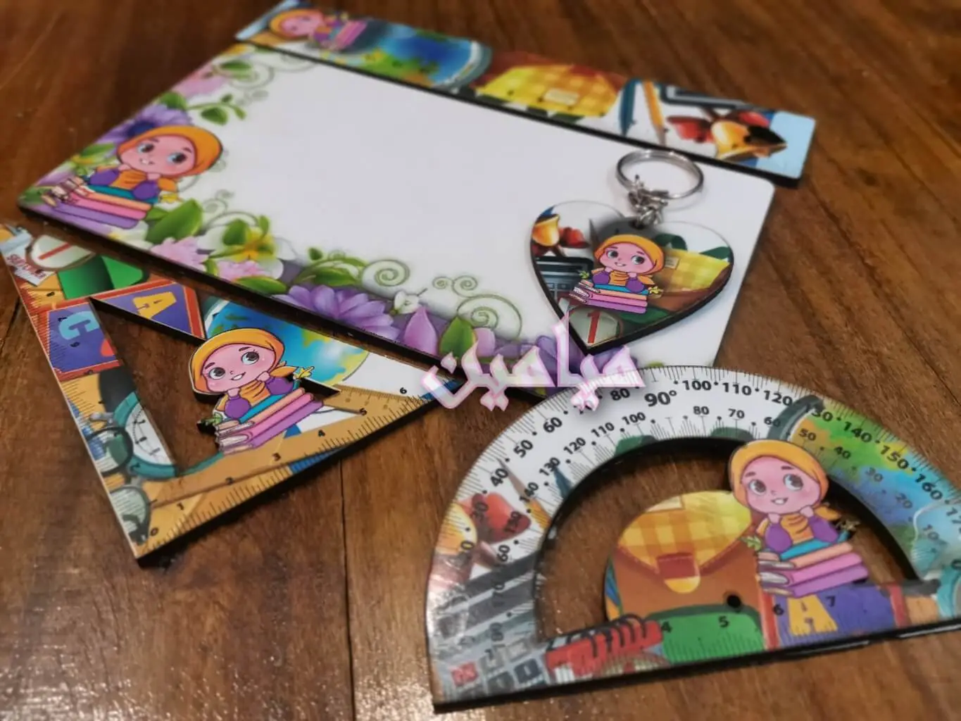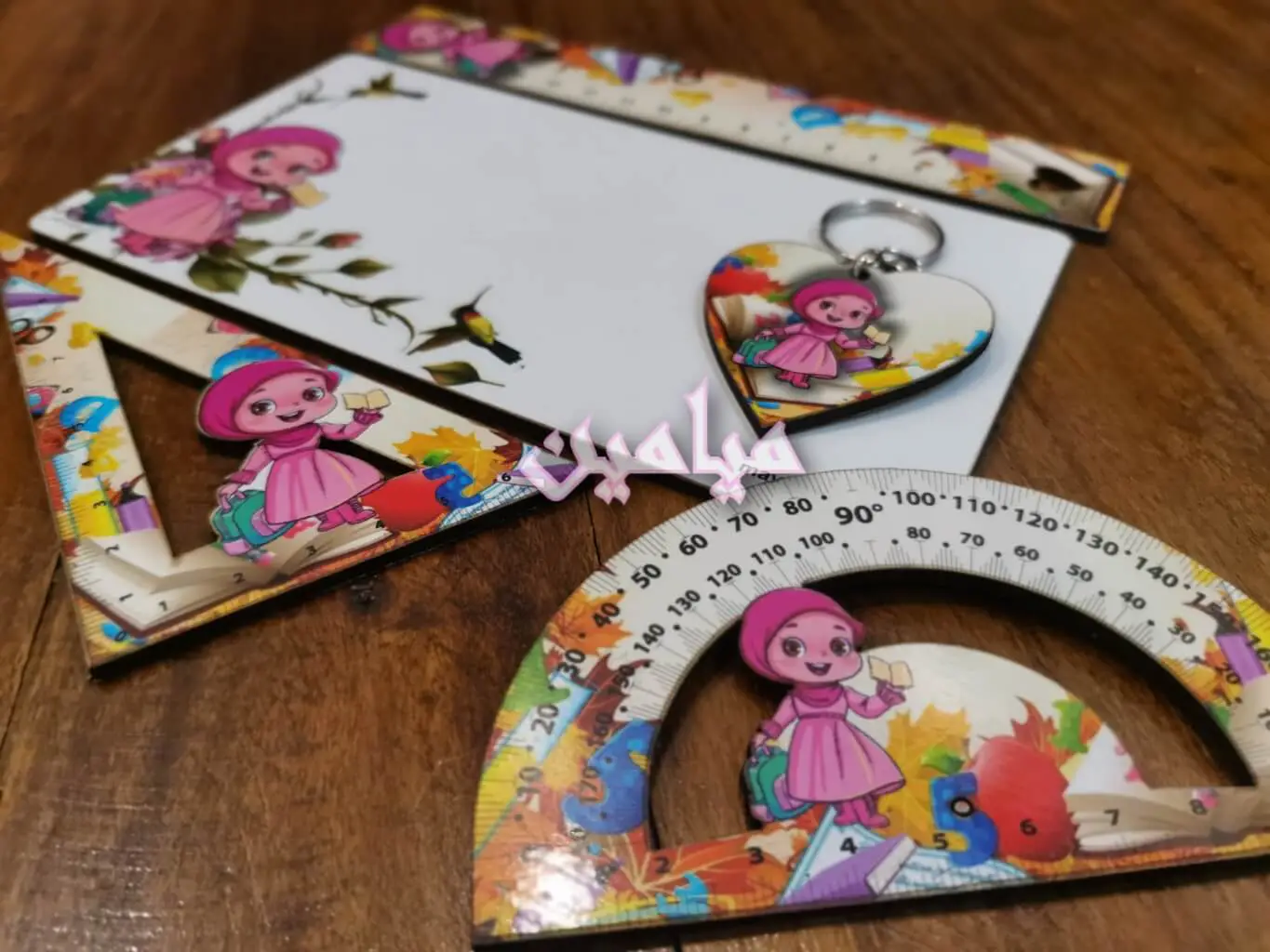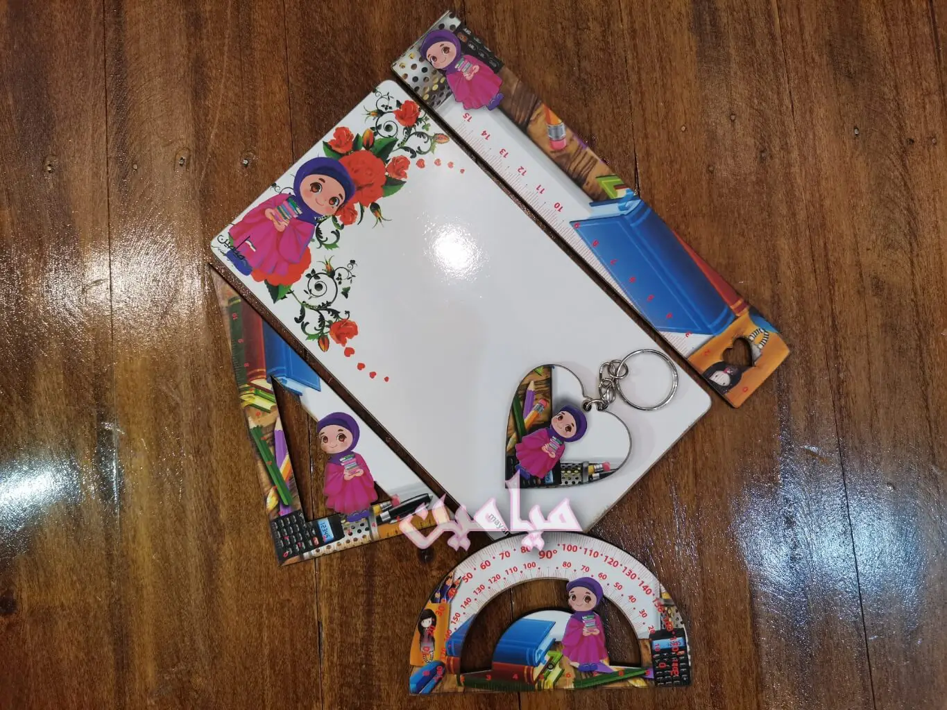 پک نوشت افزاری فانتزی دخترانه 😍 | چوبی | ۵ قلم کاربردی | خط کش، گونیا ، نقاله ، تخته وایت برد و جاسوئیچی | تنوع طرح های جذاب دخترانه | تک و عمده