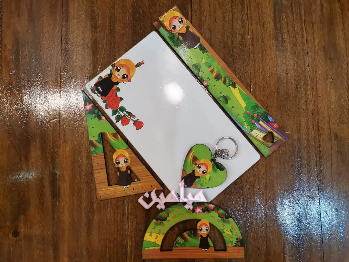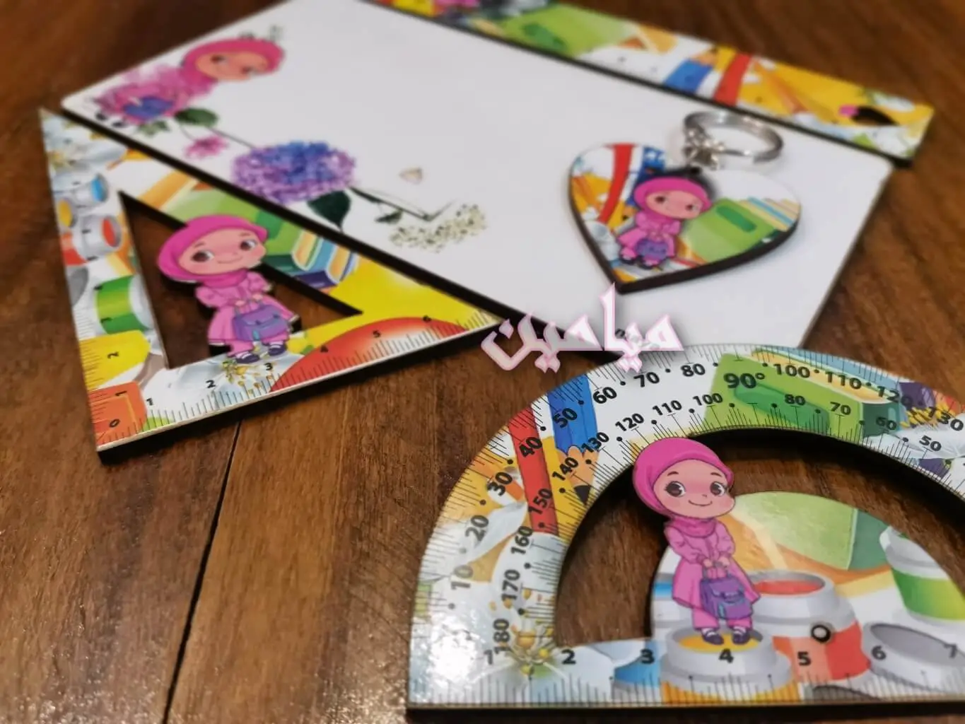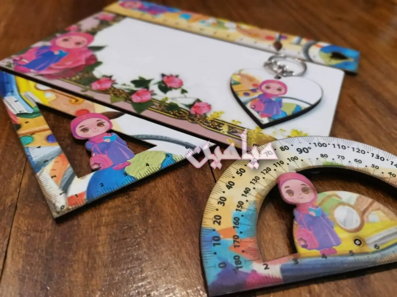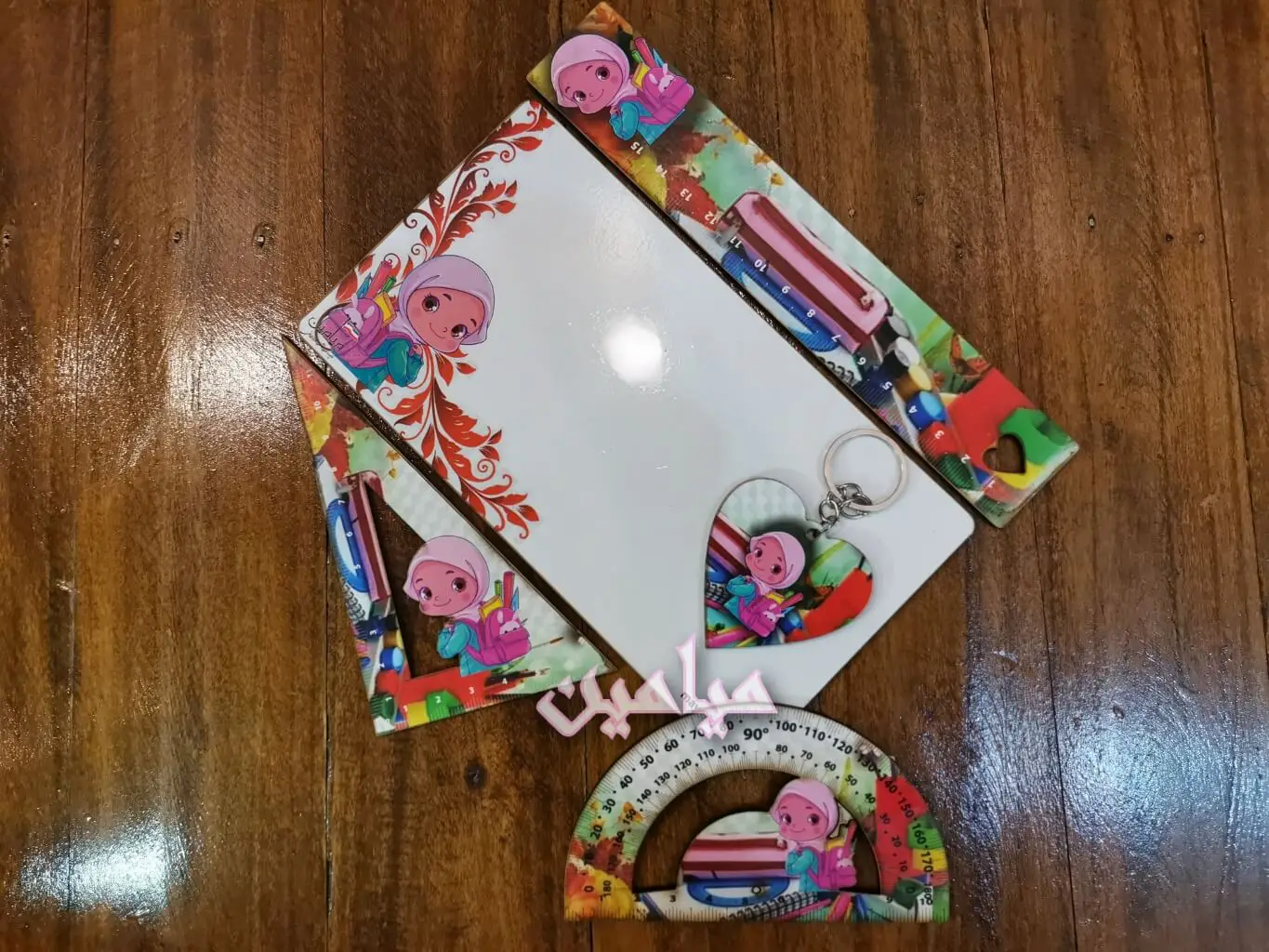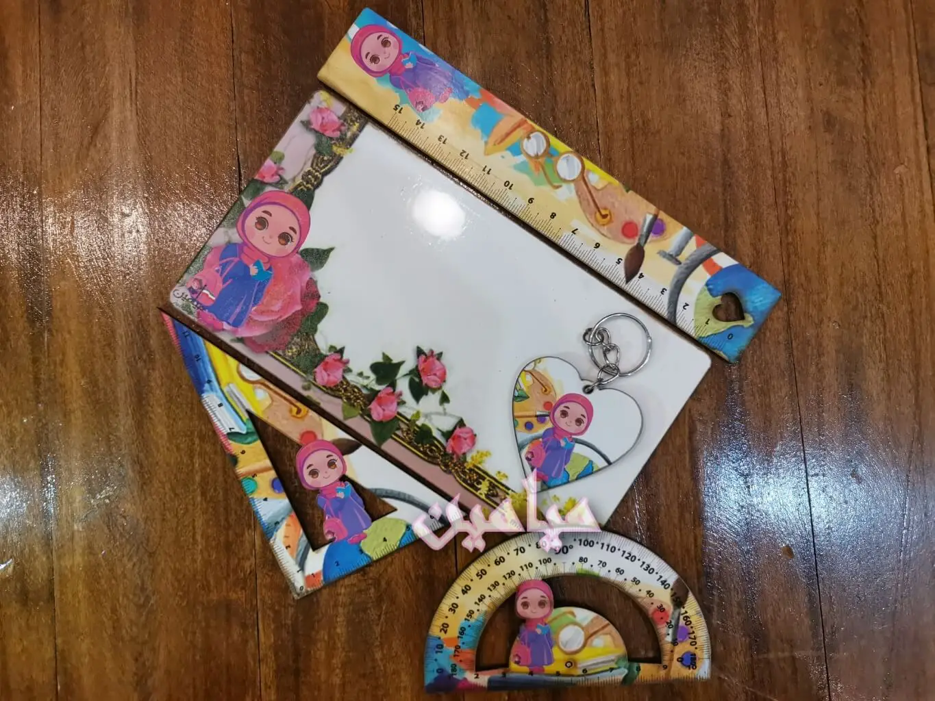 پک نوشت افزاری فانتزی دخترانه 😍 | چوبی | ۵ قلم کاربردی | خط کش، گونیا ، نقاله ، تخته وایت برد و جاسوئیچی | تنوع طرح های جذاب دخترانه | تک و عمده