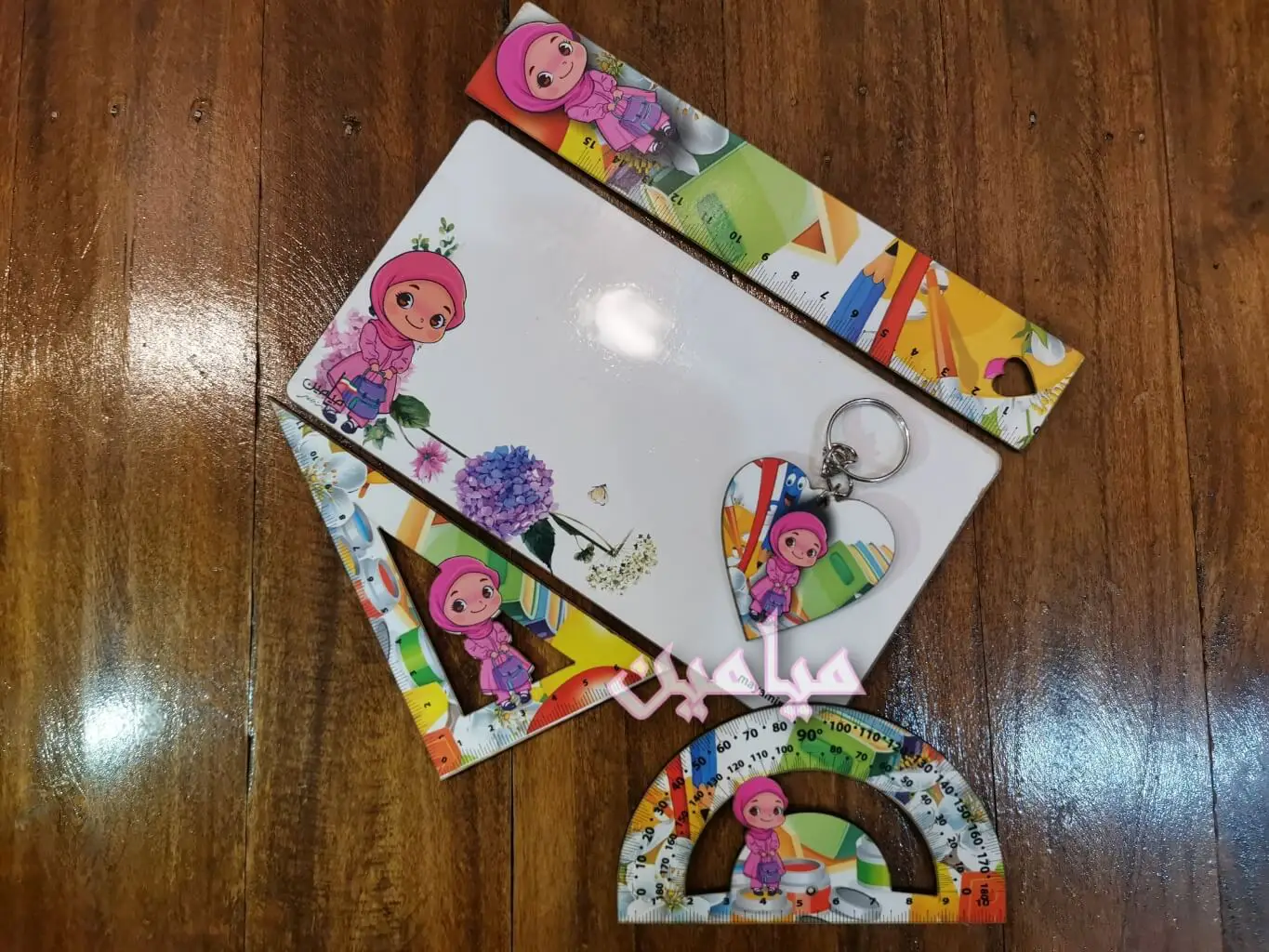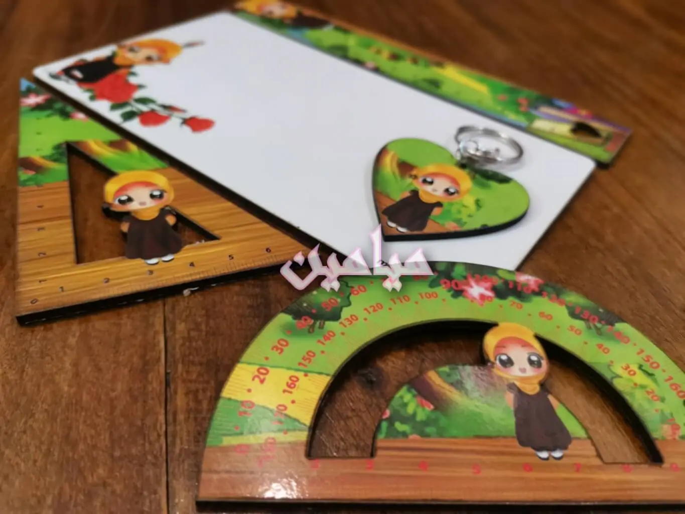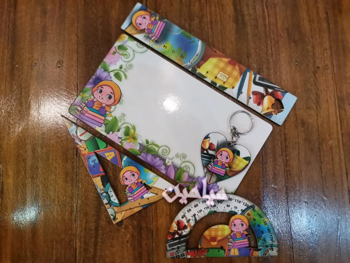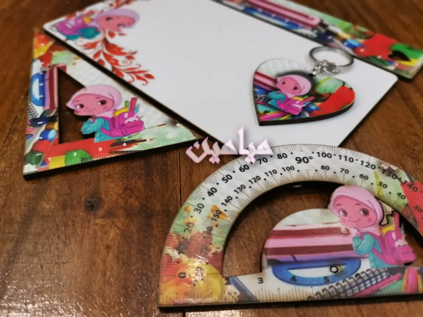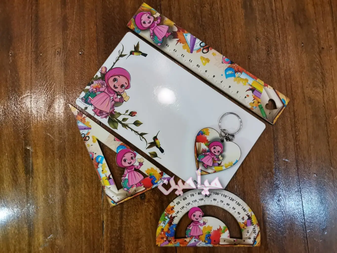 پک نوشت افزاری فانتزی دخترانه 😍 | چوبی | ۵ قلم کاربردی | خط کش، گونیا ، نقاله ، تخته وایت برد و جاسوئیچی | تنوع طرح های جذاب دخترانه | تک و عمده