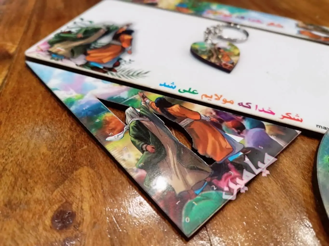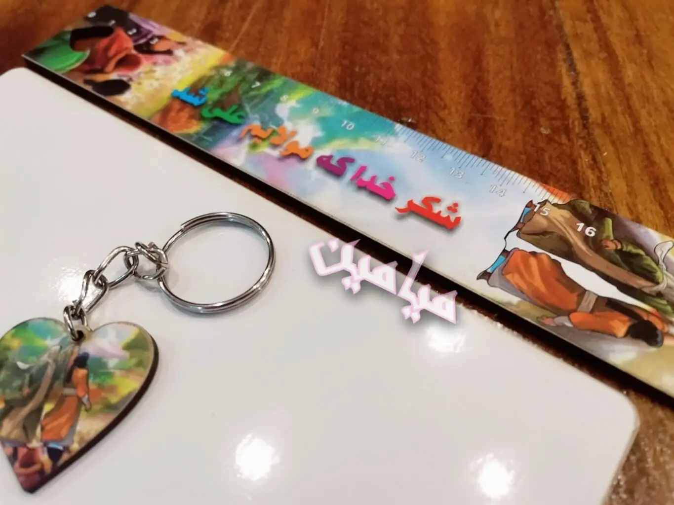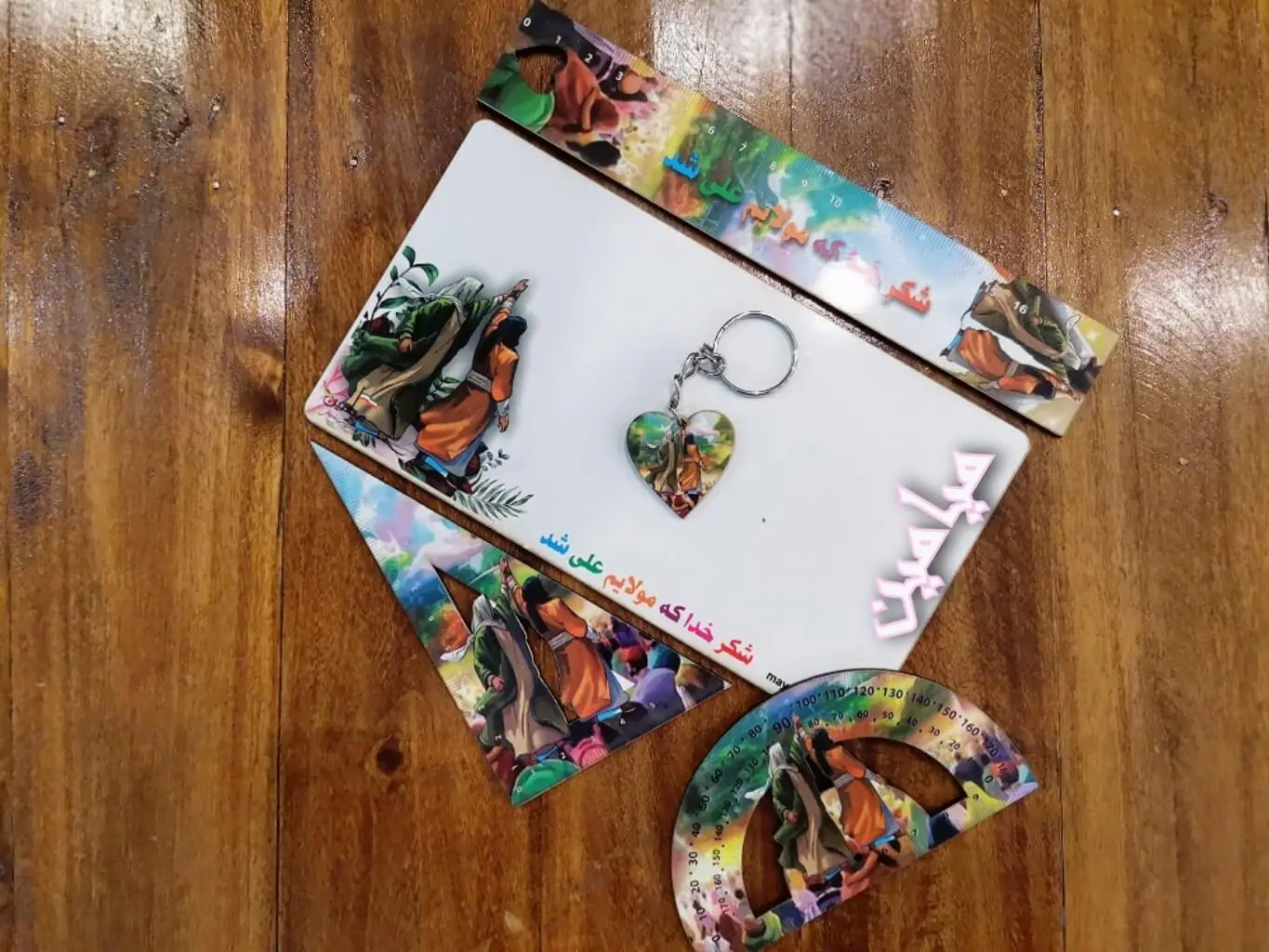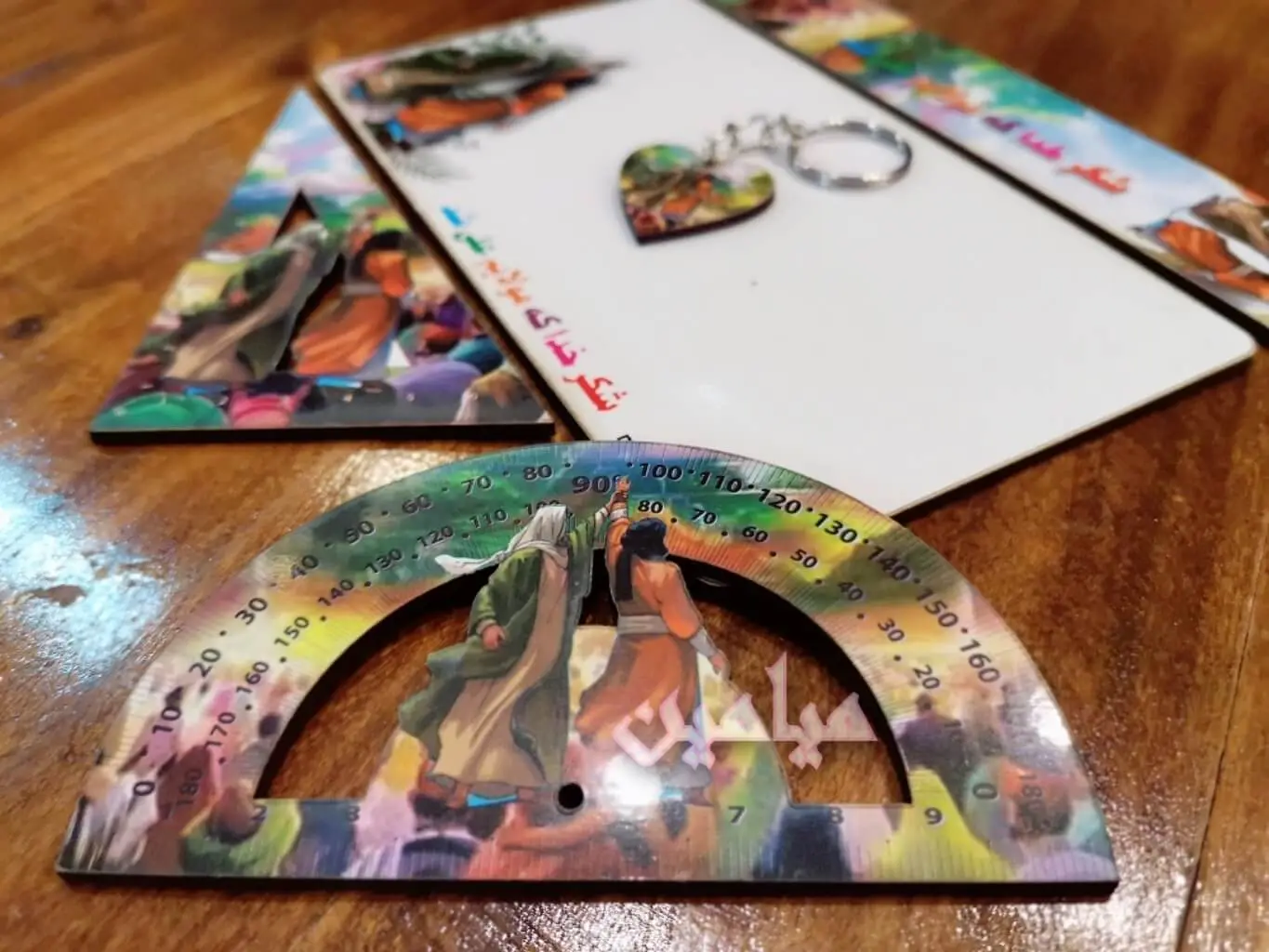 پک نوشت افزار کودکانه عید غدیر 💚 | چوبی | ۵ قلم کاربردی | خط کش، گونیا ، نقاله ، تخته وایت برد و جاسوئیچی | تک و عمده
