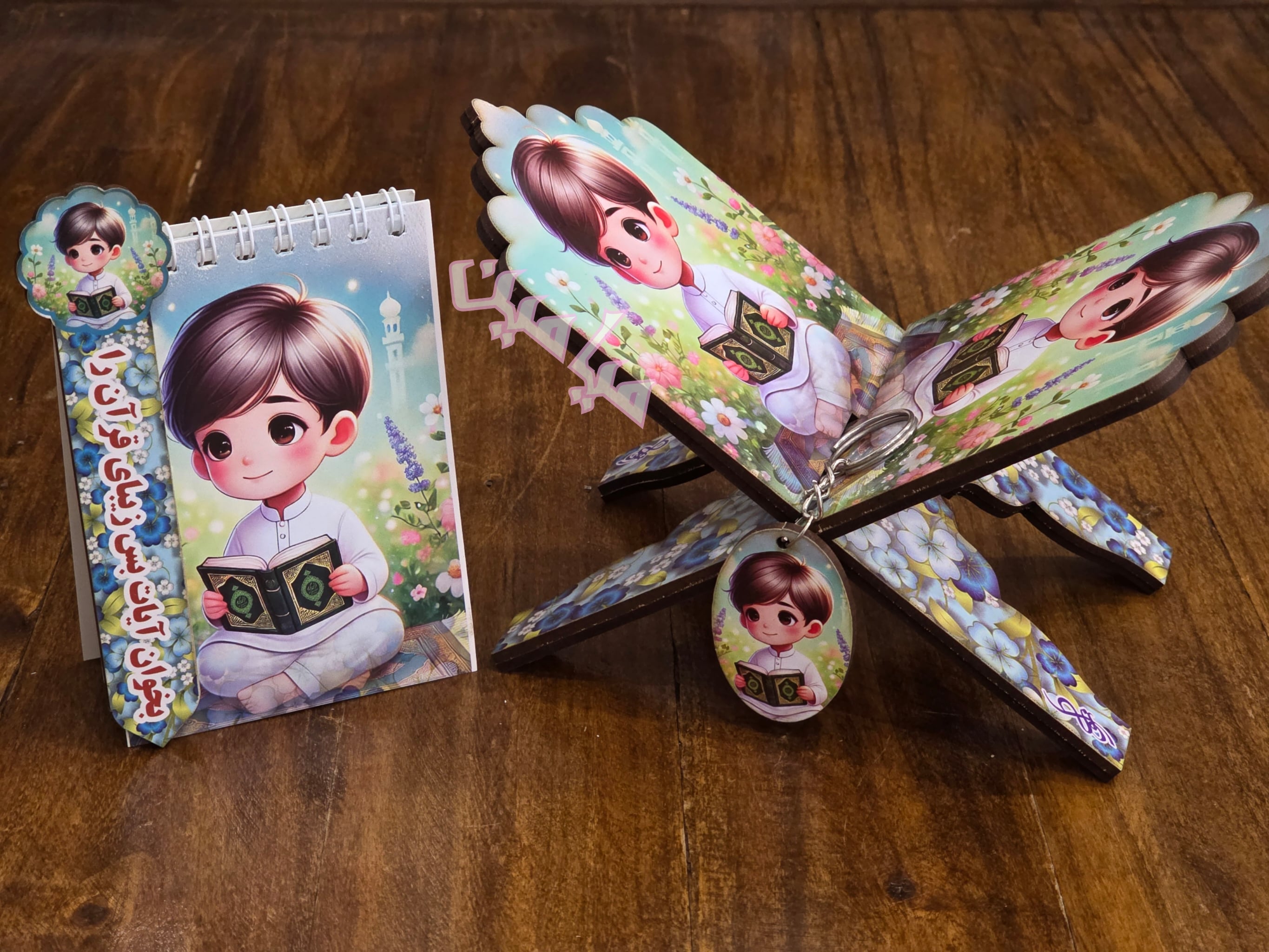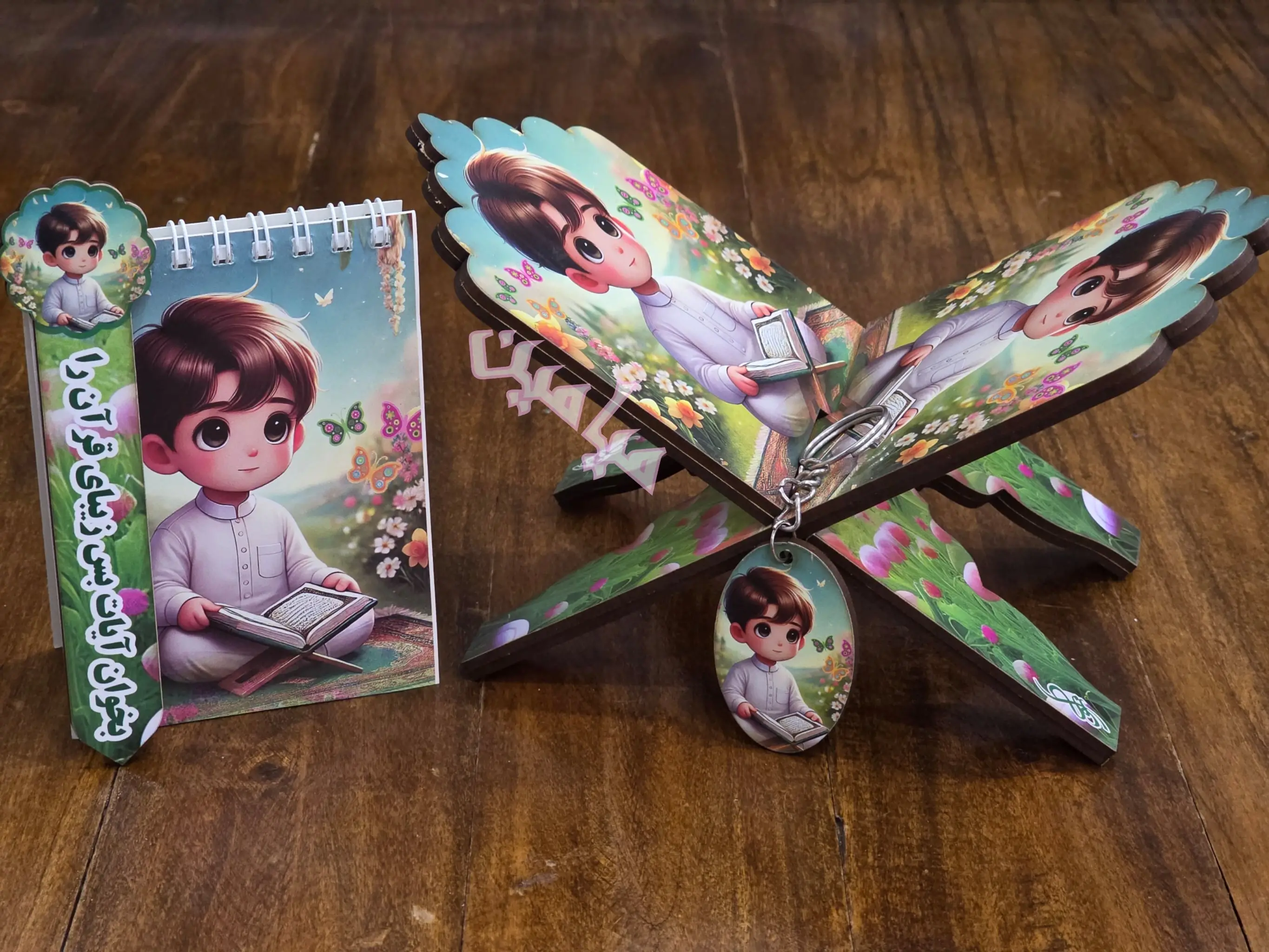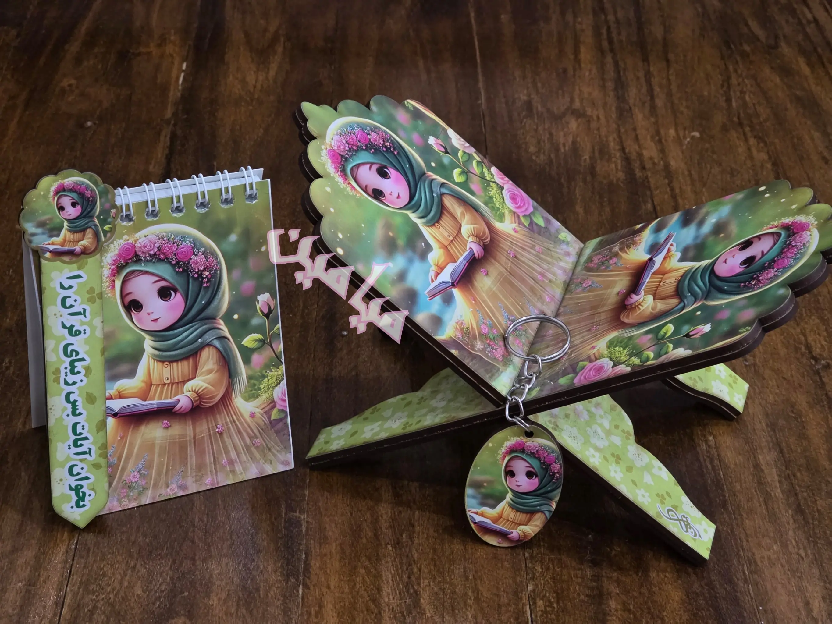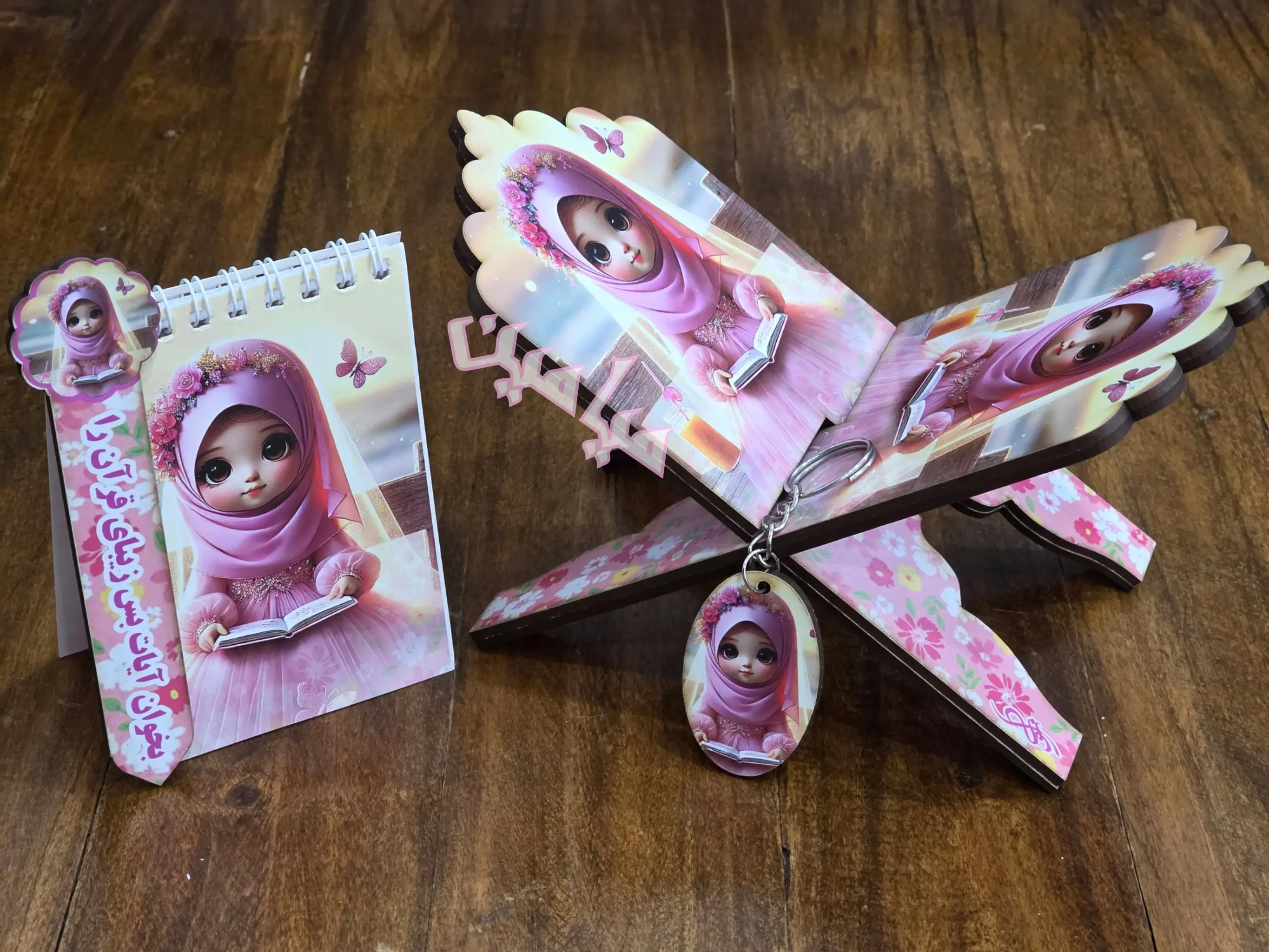 پک ۴ قلم قرآنی کودکانه ❤️| دخترانه و پسرانه | رحل ، دفترچه ، جاسوئیچی و نشانگر | چوبی | تنوع طرح های جذاب | تک و عمده