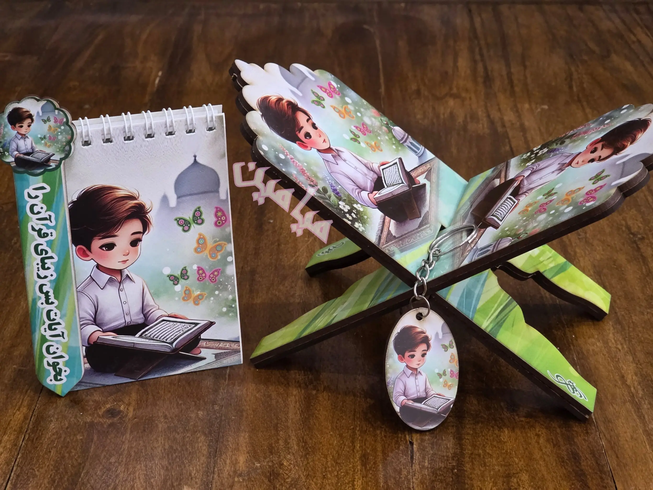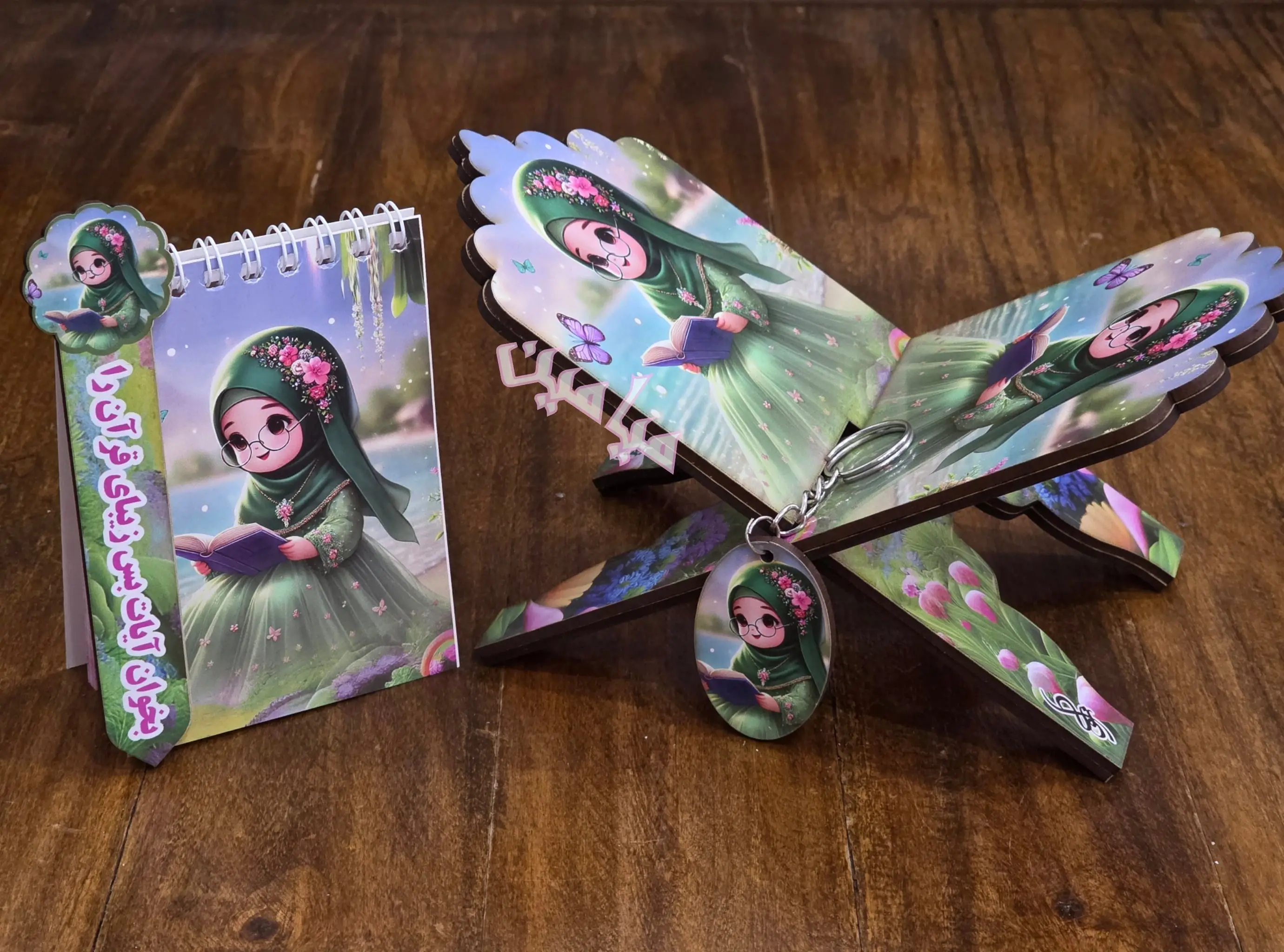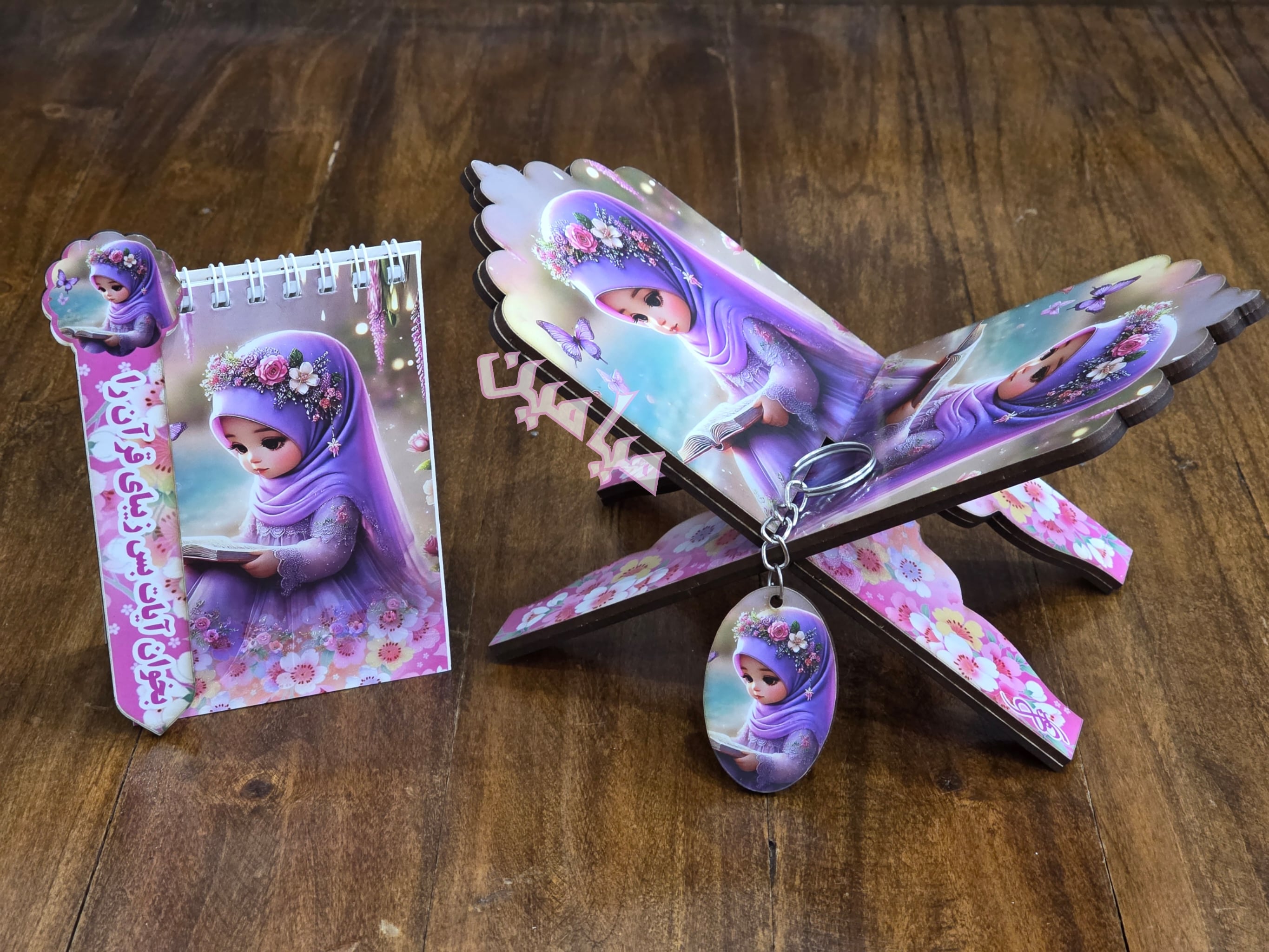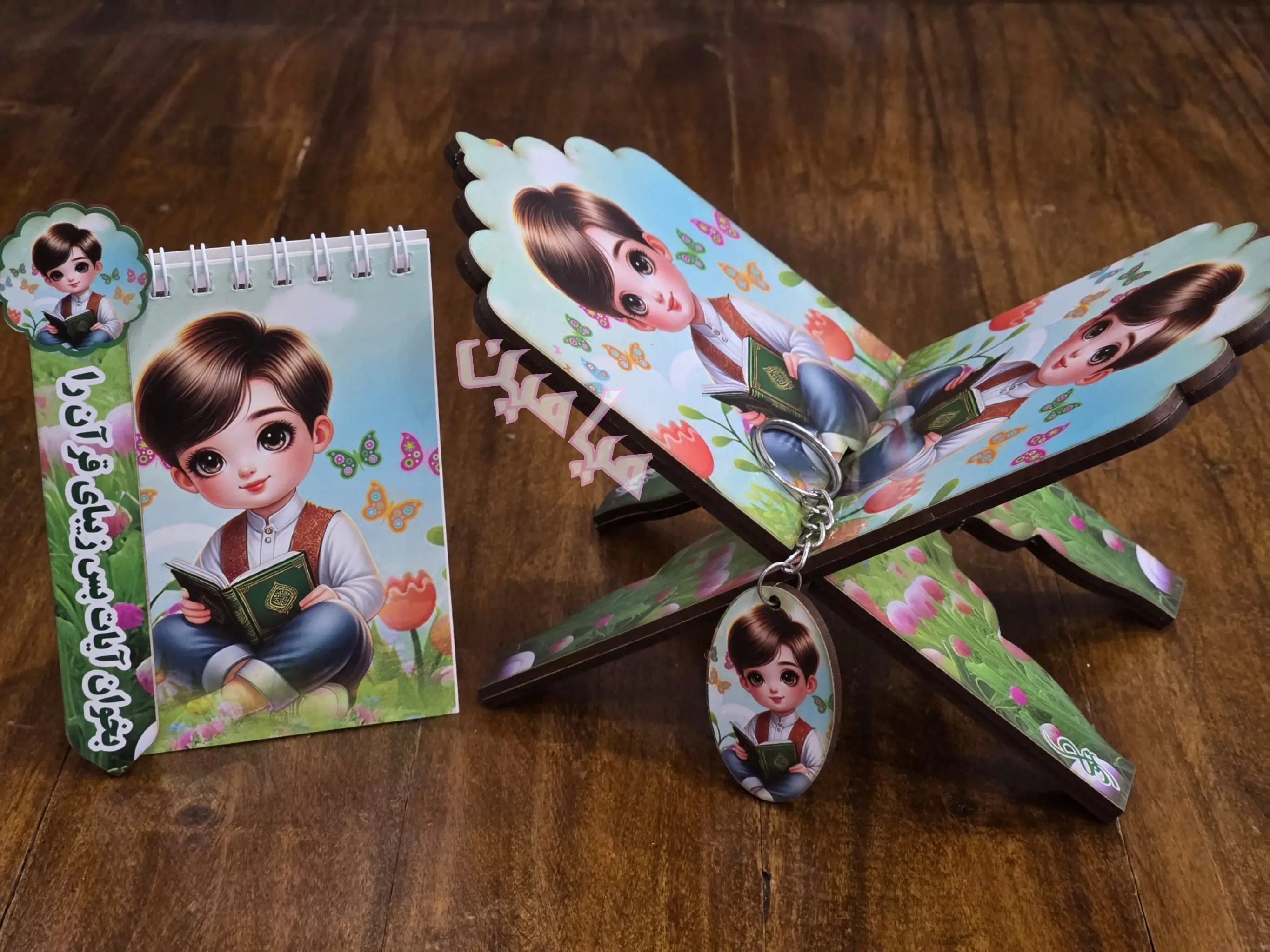 پک ۴ قلم قرآنی کودکانه ❤️| دخترانه و پسرانه | رحل ، دفترچه ، جاسوئیچی و نشانگر | چوبی | تنوع طرح های جذاب | تک و عمده