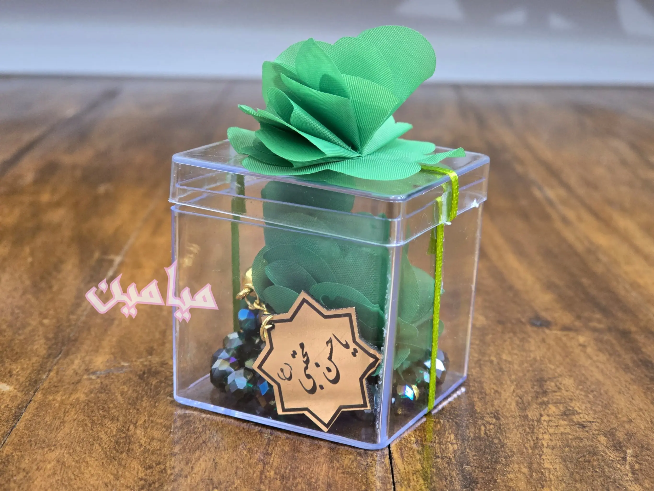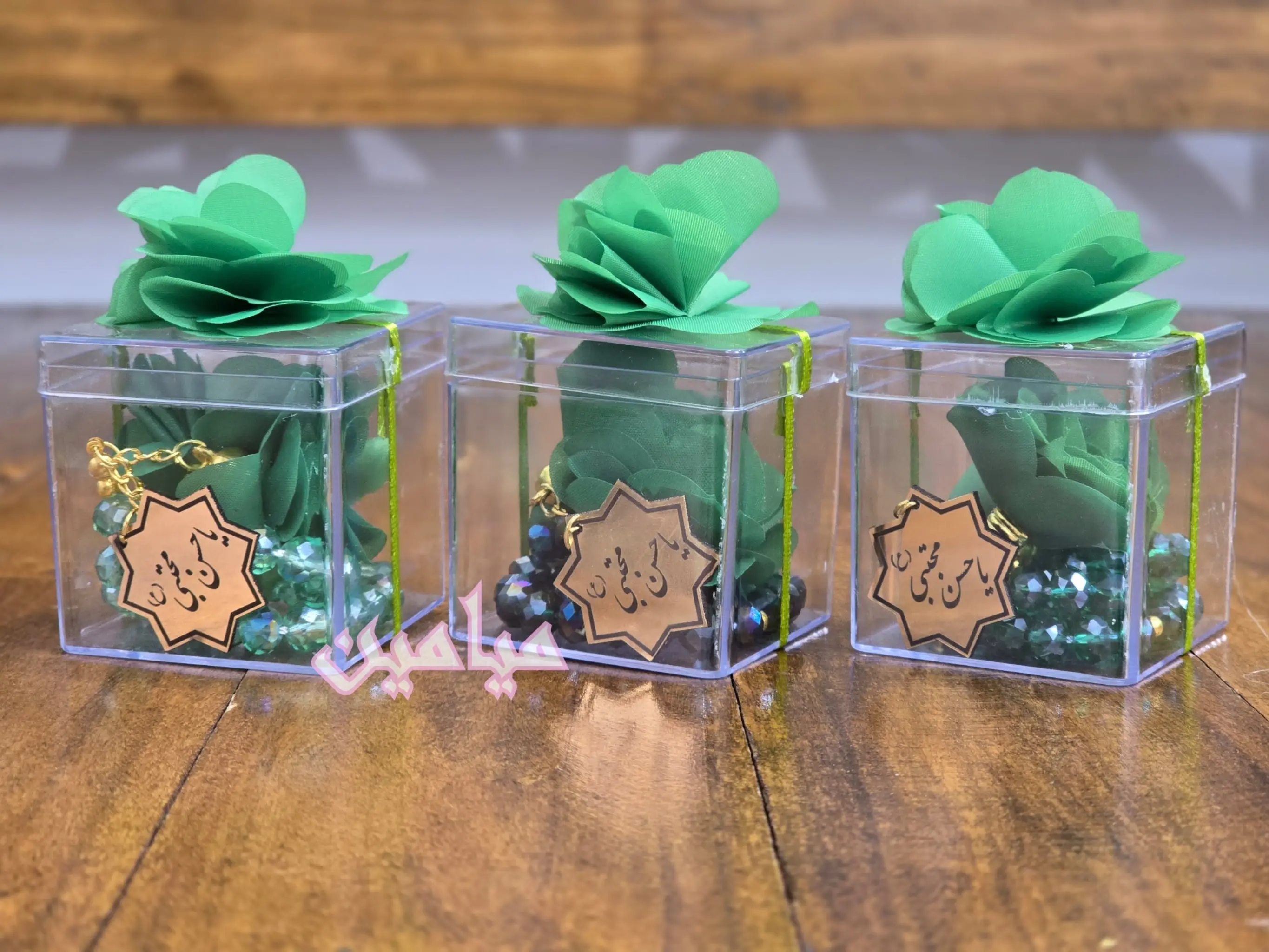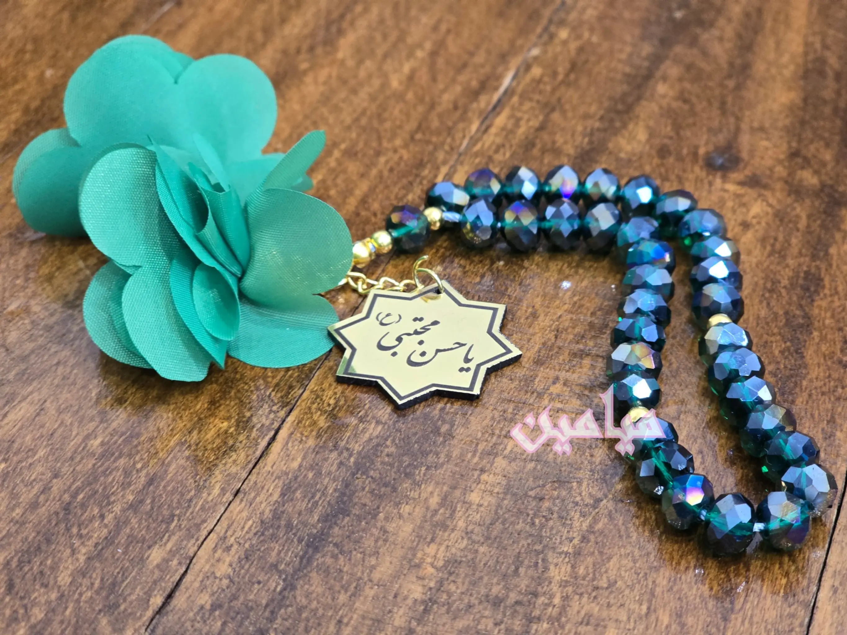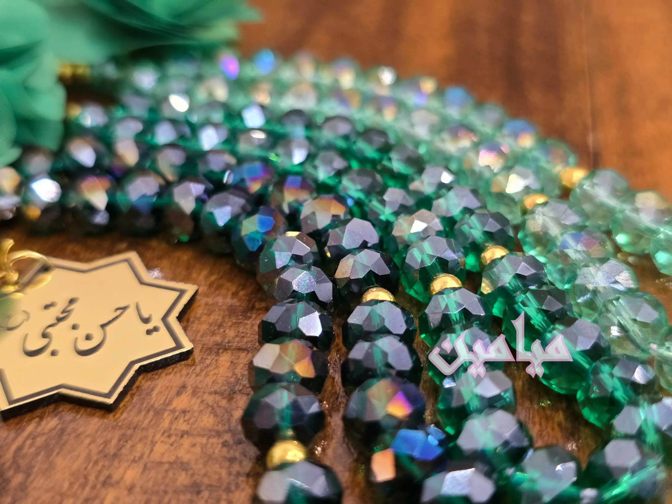 گیفت تسبیح امام حسن مجتبی (ع) |💚 تسبیح کریستالی ۳۳ تایی با پلاک طلایی | بهمراه باکس طلقی جذاب | تک و عمده