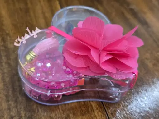 پک هدیه جشن تکلیف دخترانه ❤️ | تسبیح کریستالی ۳۳ تایی صورتی با پلاک طلایی حجاب + ۲ آبنبات+ باکس قلبی طلقی گل دار| تک و عمده